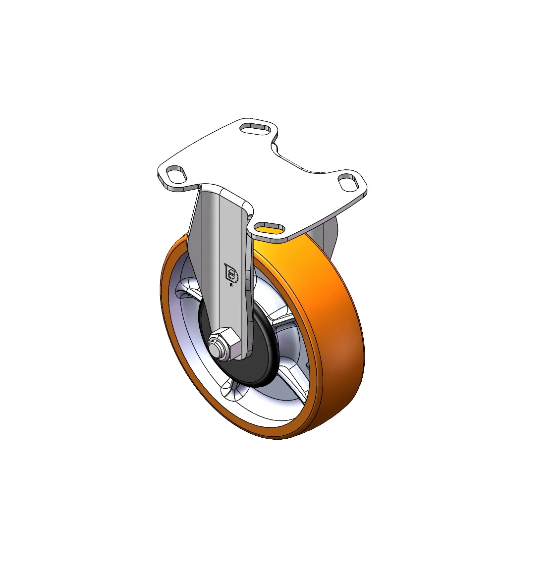 Rigid Caster with integral Stamping Fork and 85 x 70mm (3-3/8" x 2-3/4") Bolt Hole Spacing. Zine-Plated, Top Plate (3.5T) Mounting Type system. Cast Iron Wheel Center with High Quality Polyurethane tread. Brown color, Ball Bearing.