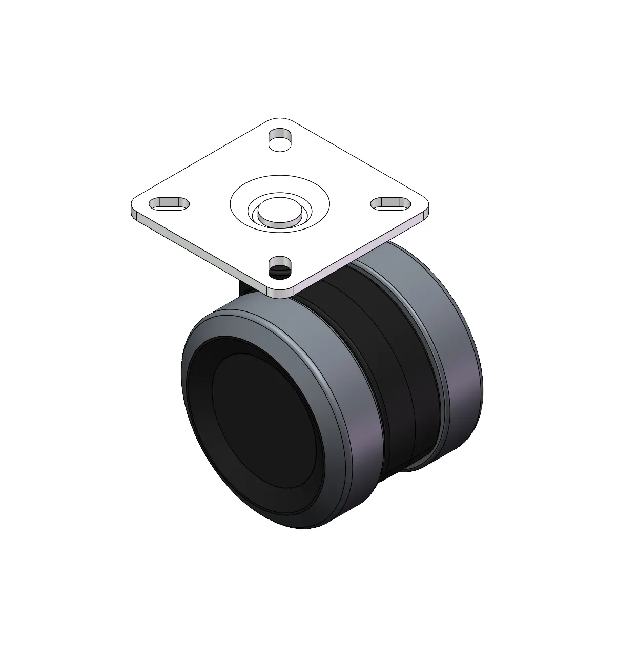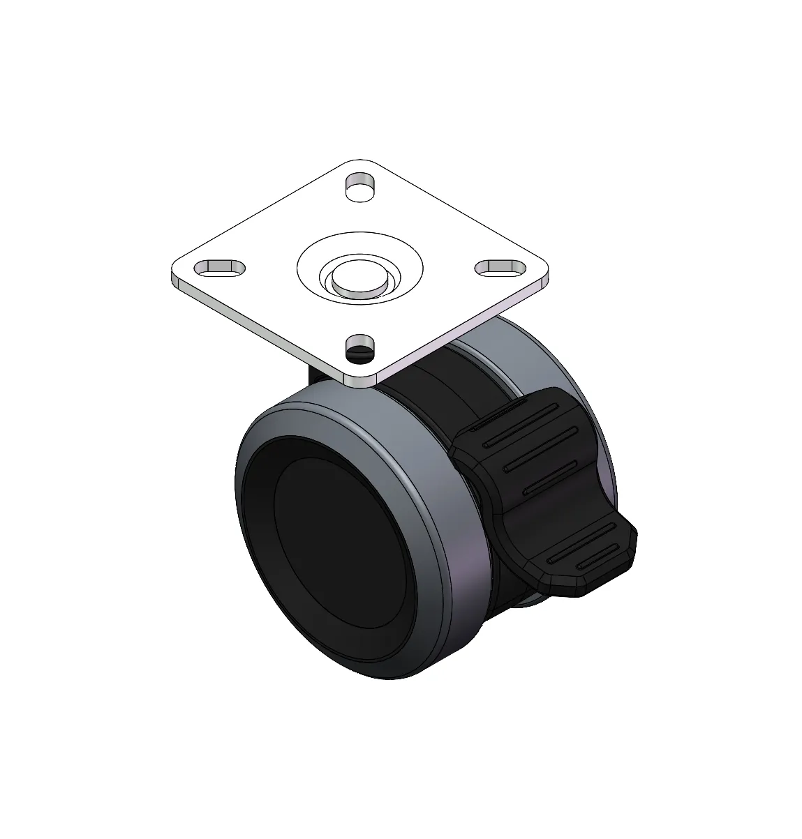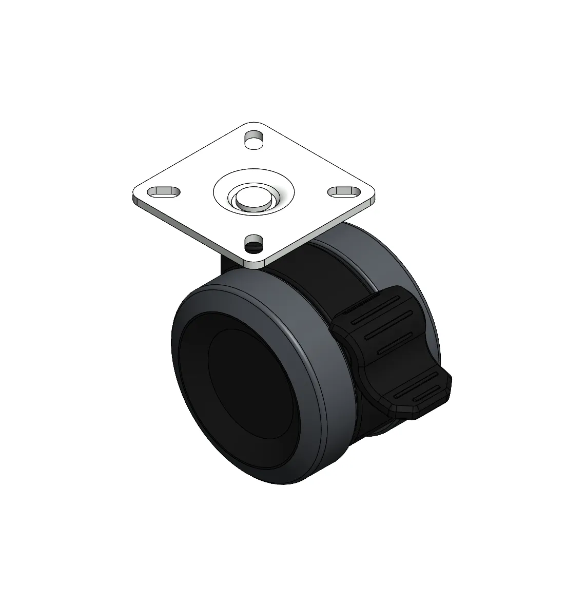 Swivel Caster with injection-molded Fork Riveted to Top Plate. reinforced Polypropylene Fork, Top Plate (3T) Mounting Type system Polypropylene (PP) core, polyvinyl chloride (PVC) tread Dark gray, Anti-thread wheel cover.