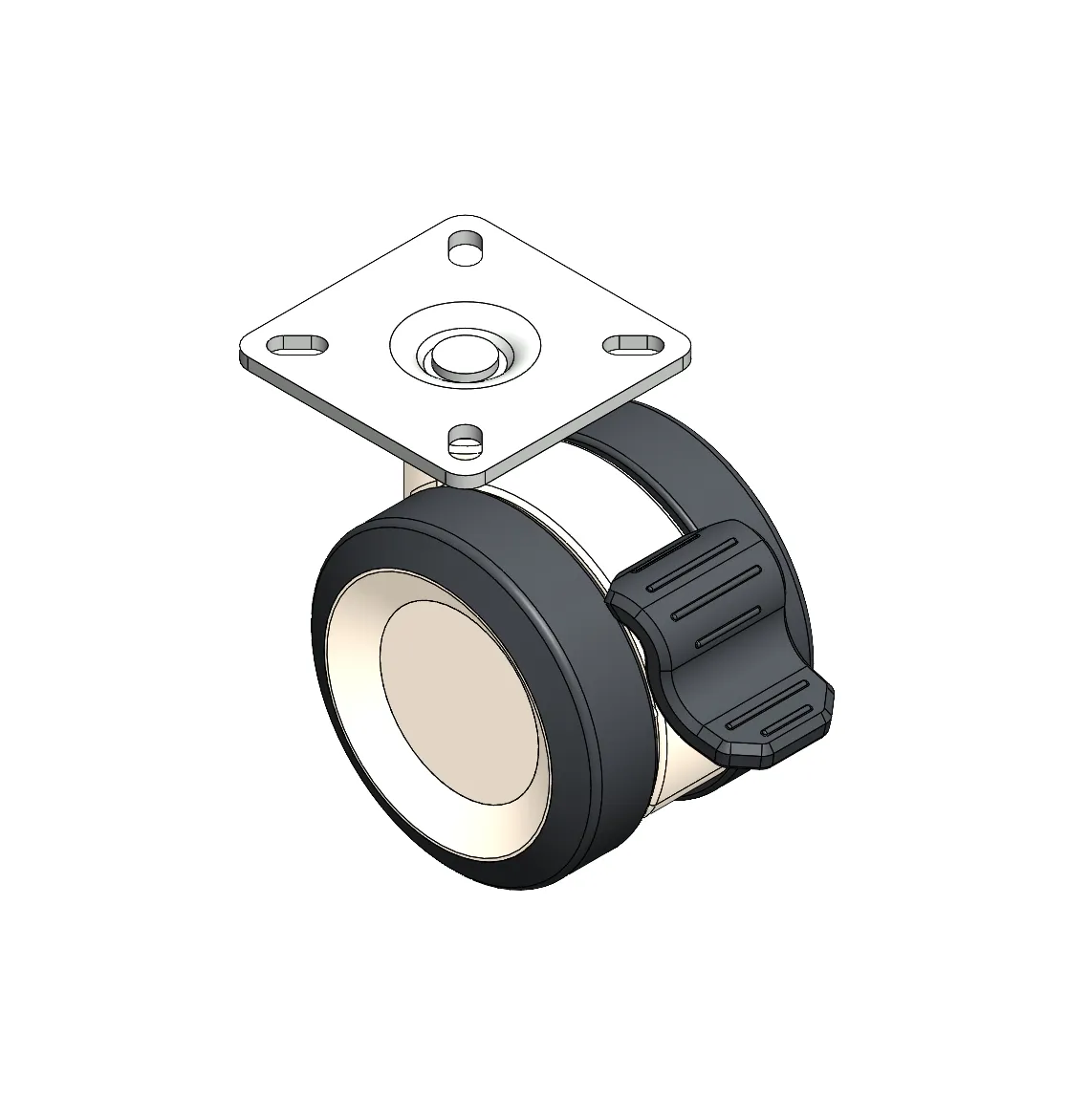 Single Brake locking system and a Fork-Riveted, injection-molded Fork. reinforced Polypropylene Fork with Fork-mount (3T) Mounting Type system Polypropylene (PP) Wheel Center, polyvinyl chloride (PVC) tread White-dark gray, wheel - Plain Bearing.