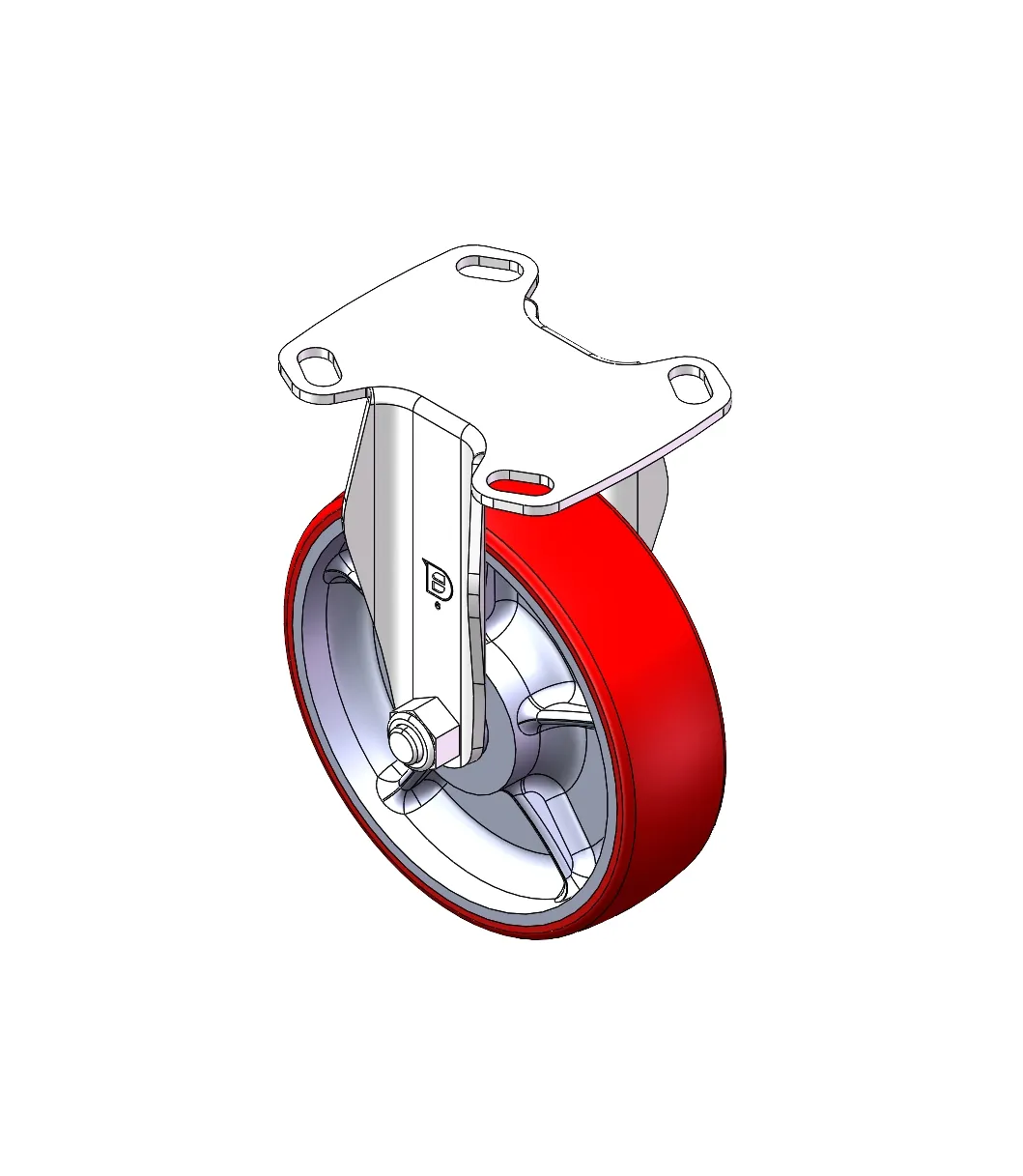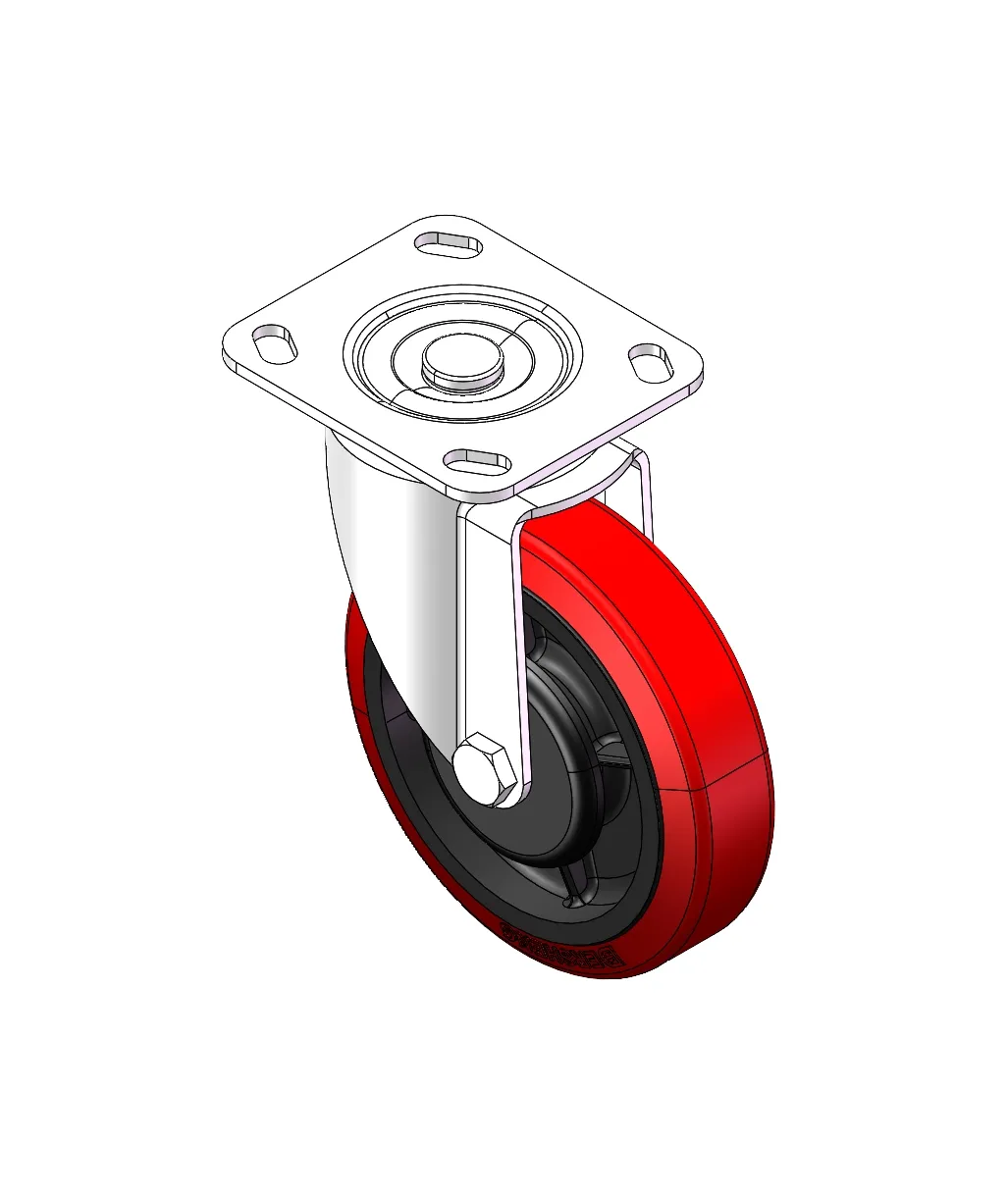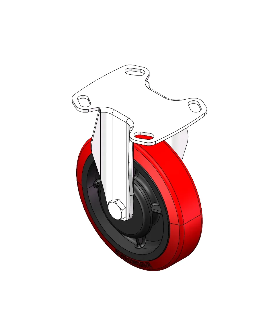 Rigid Caster with integral Stamping Fork and D-shaped hole. Zine-Plated, Top Plate (3.5T) Mounting Type system. Cast Iron Wheel Center with High Quality Polyurethane tread. Red Cast Iron finish, Ball Bearing.