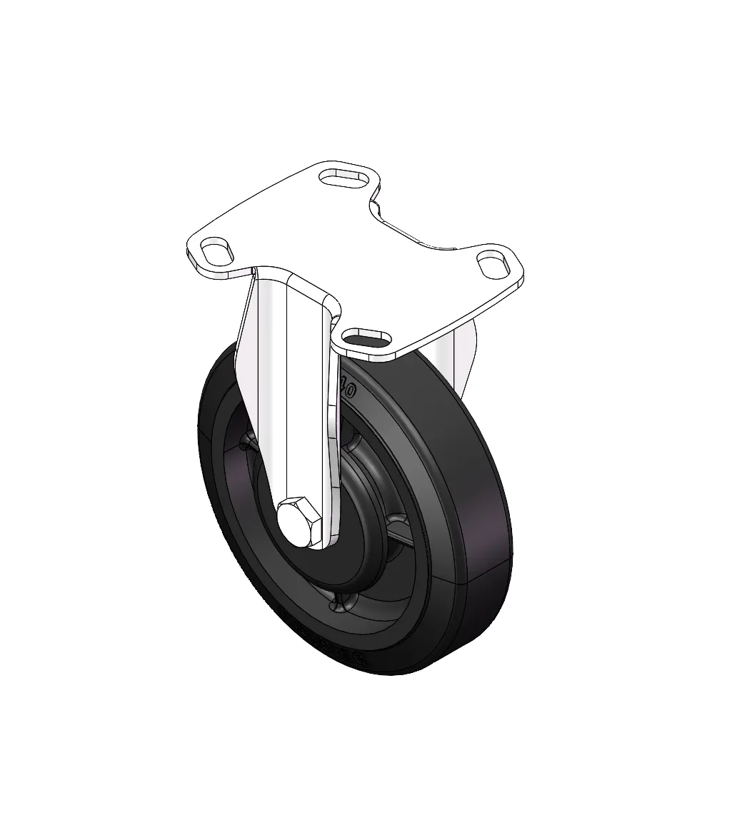 Rigid Caster with integral Stamping Fork and 85 x 70mm (3-3/8" x 2-3/4") Bolt Hole Spacing. Zine-Plated, Top Platestyle (3.5T) Mounting Type system. Cast Iron Wheel Center with High-Quality Resilient Rubber tread. Iron black, Bearing with Ball Bearing.
