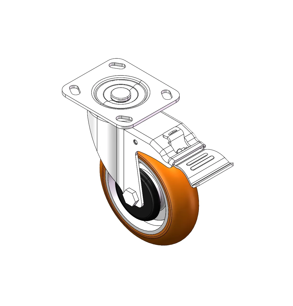 Casters with Total Brakes and Locking system. Top Plate Riveted and Stamping 85 x 70mm (3-3/8" x 2-3/4") Bolt Hole Spacing. Zine-Plated, Top Plate (4T) Mounting Type system. Cast Iron Wheel Center with High Quality Polyurethane tread. Brown color, Bearing with Ball Bearing.