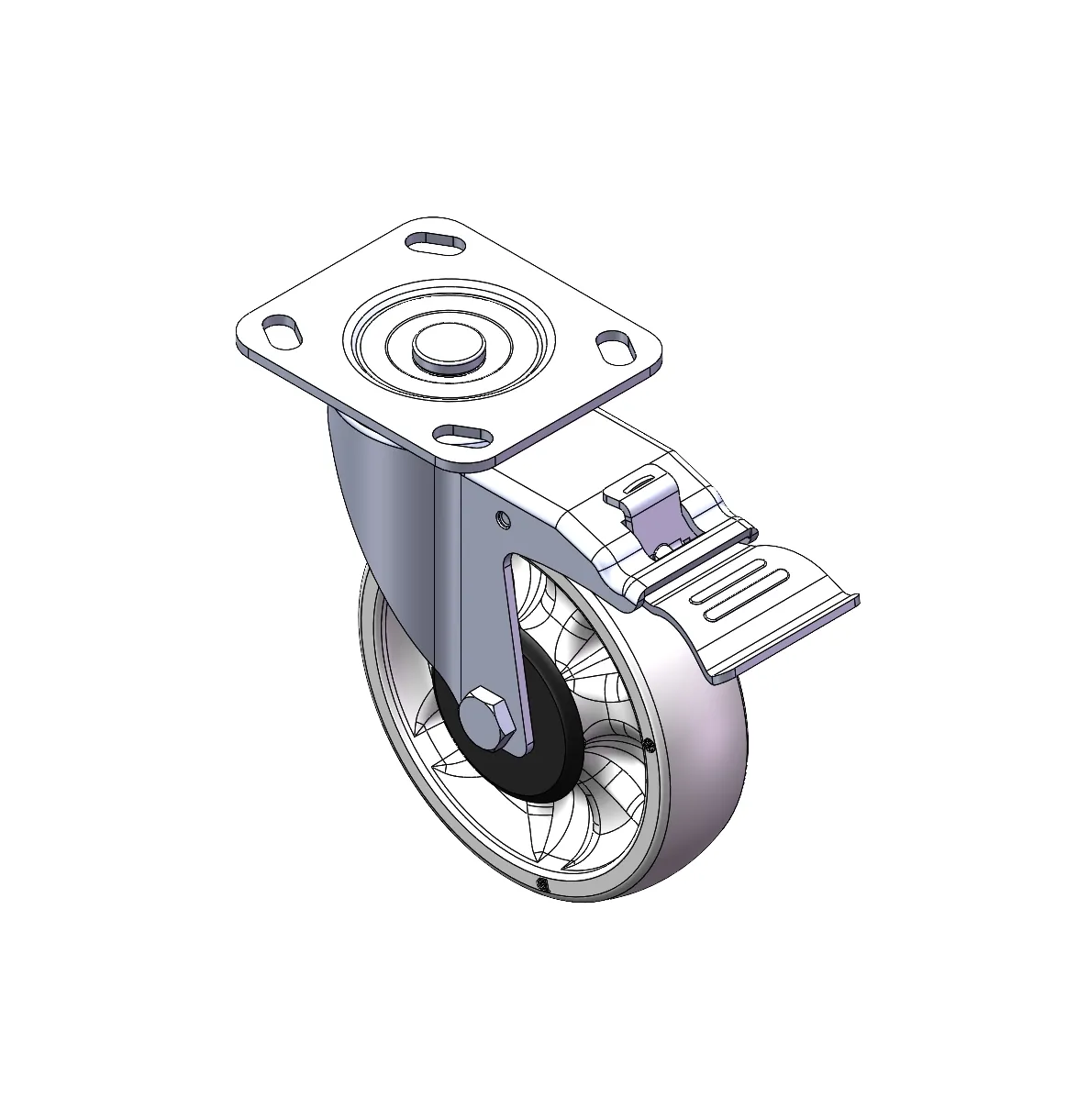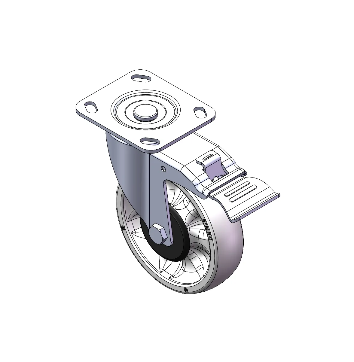 Castors with Total Brake Locking system. Top Plate Riveted Stamping Fork - 85 x 70mm (3-3/8" x 2-3/4") Bolt Hole Spacing Surface Zine-Plated, Top Plate (4T) Mounting Type device Reinforced thermoplastic plastic Wheel Center and Wheel Tread Bearing - Ball Bearing.