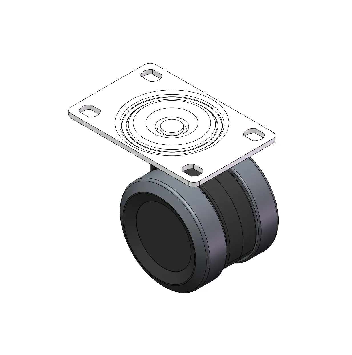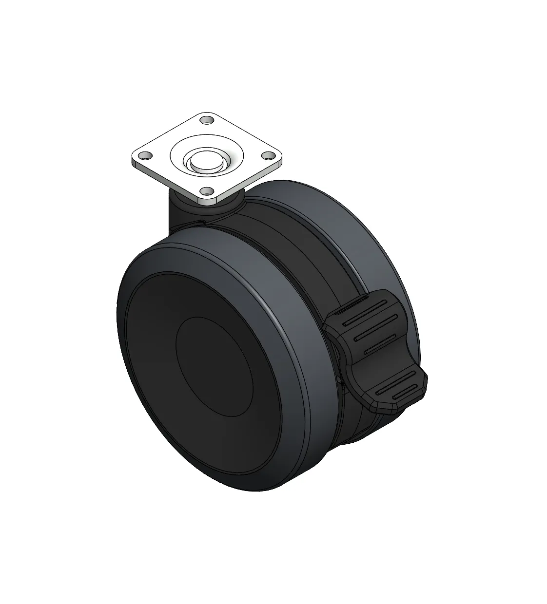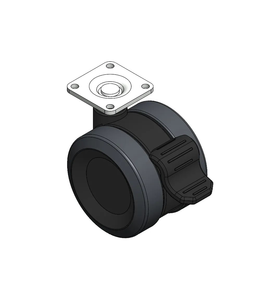 Swivel Caster with injection-molded Fork Riveted to Top Plate. reinforced Polypropylene Fork, Top Plate (3T) Mounting Type system Polypropylene (PP) core, polyvinyl chloride (PVC) tread Dark gray, Anti-thread wheel cover.