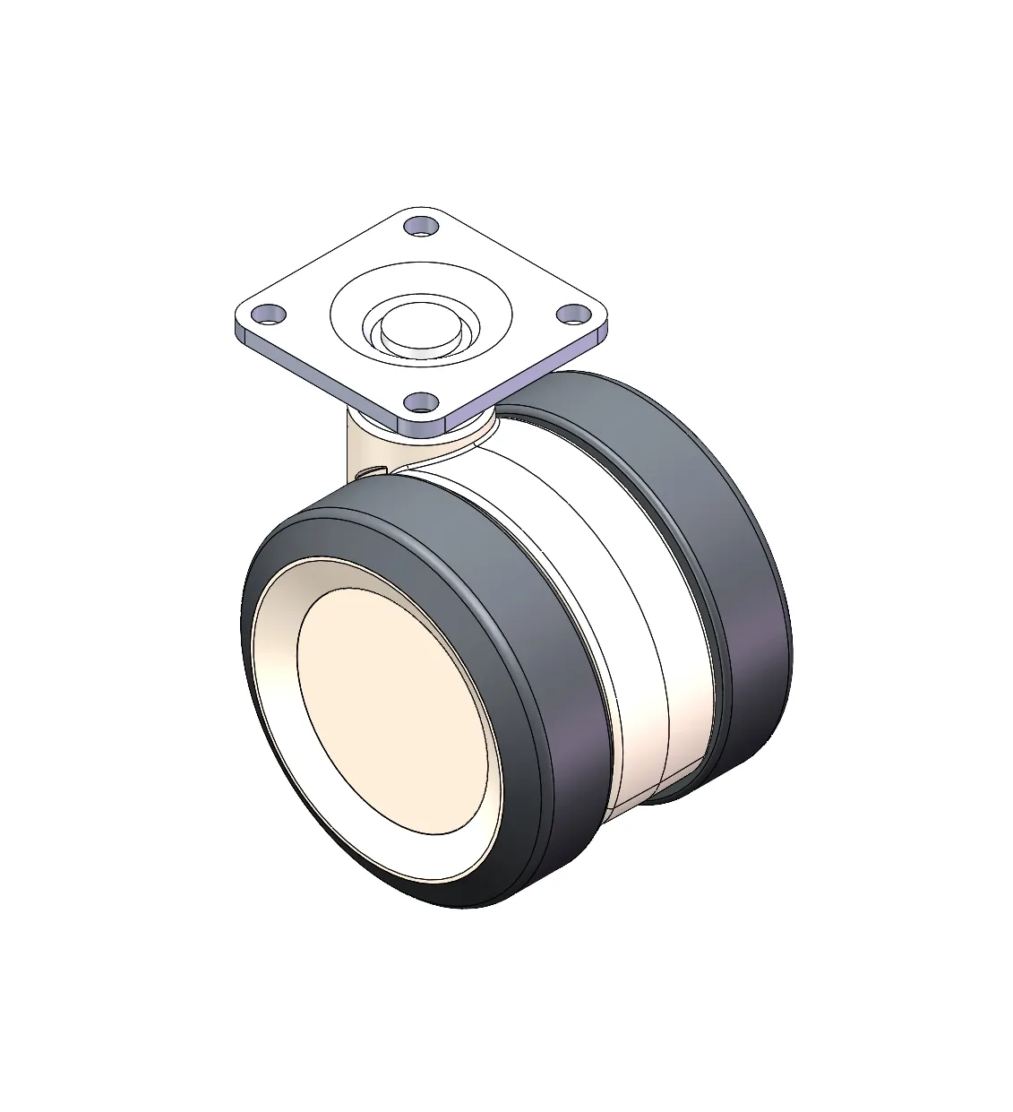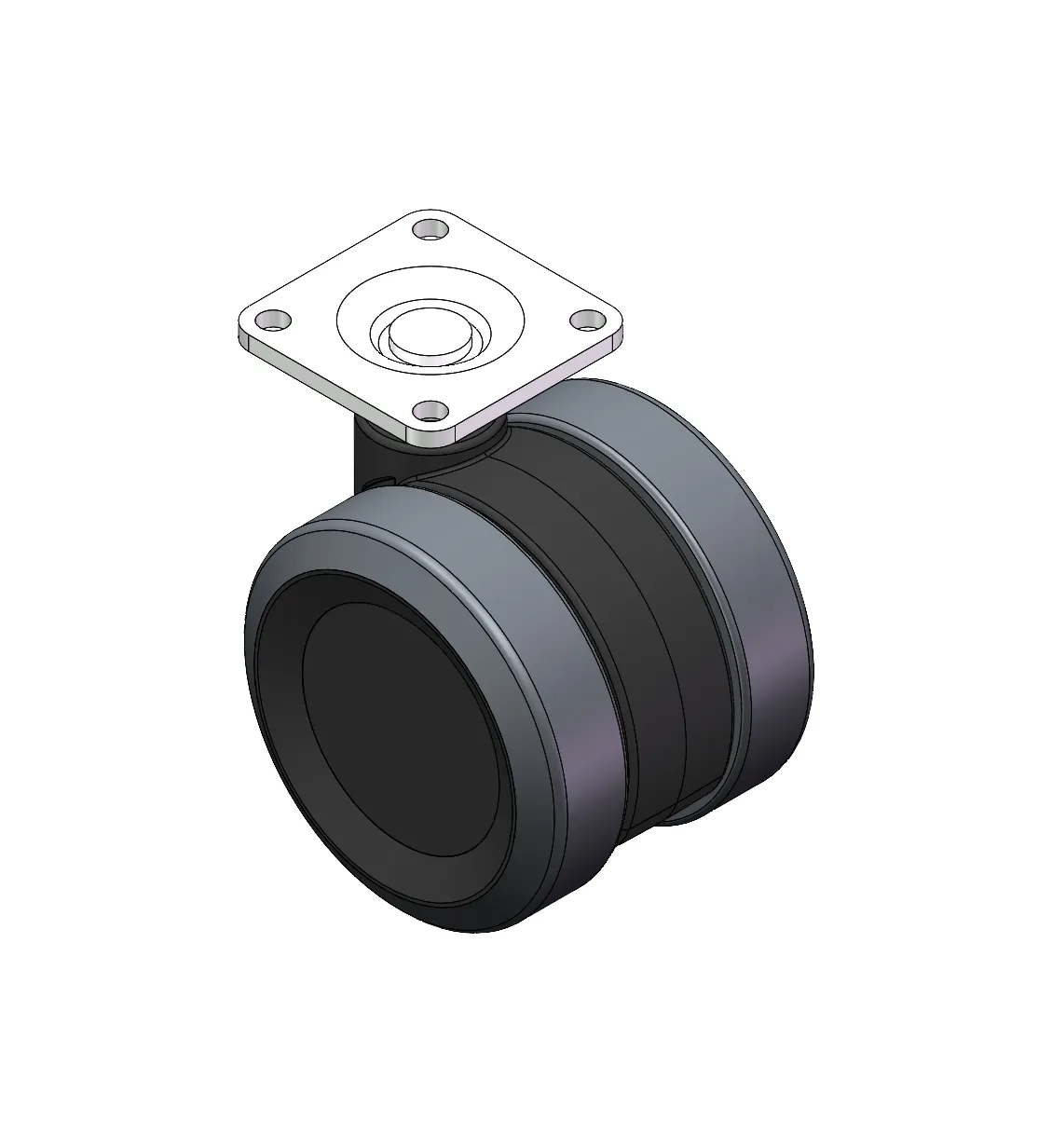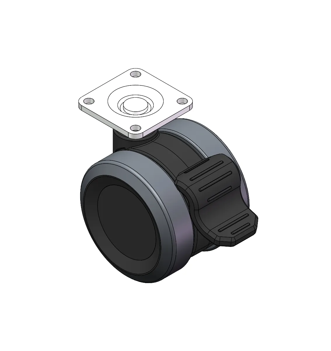 Swivel Caster with injection-molded Fork Riveted to Top Plate. reinforced Polypropylene Fork, Top Plate (3T) Mounting Type system Polypropylene (PP) core, polyvinyl chloride (PVC) tread Dark gray, Anti-thread wheel cover.