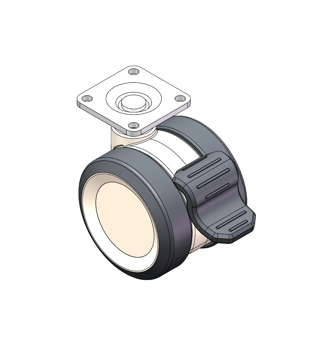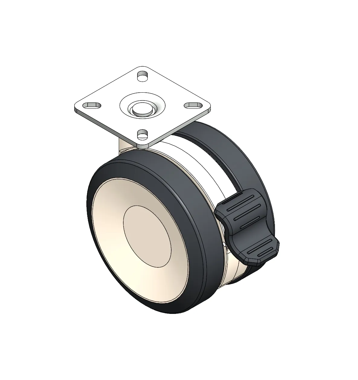 Castors with single brake Locking system, Fork Riveted injection moulded Fork. Frame made of reinforced High-quality Impact Resistance Polypropylene, Top Plate (3T) Mounting Type Wheel core made of High-quality Impact Resistance Polypropylene (PP), Wheel Tread made of polyvinyl chloride (PVC) White dark grey, Bearing – Ball Bearing.