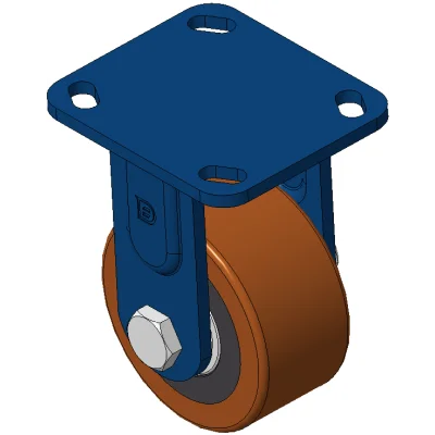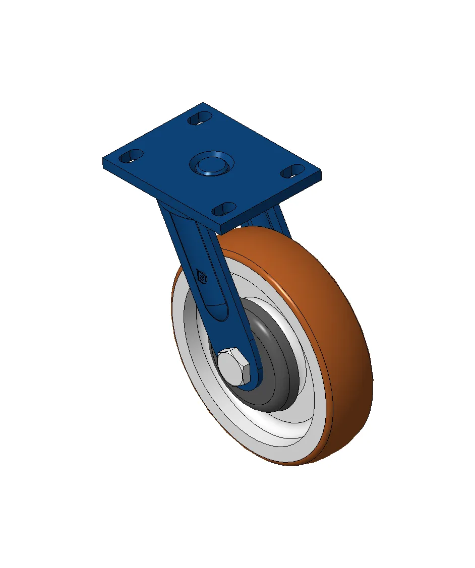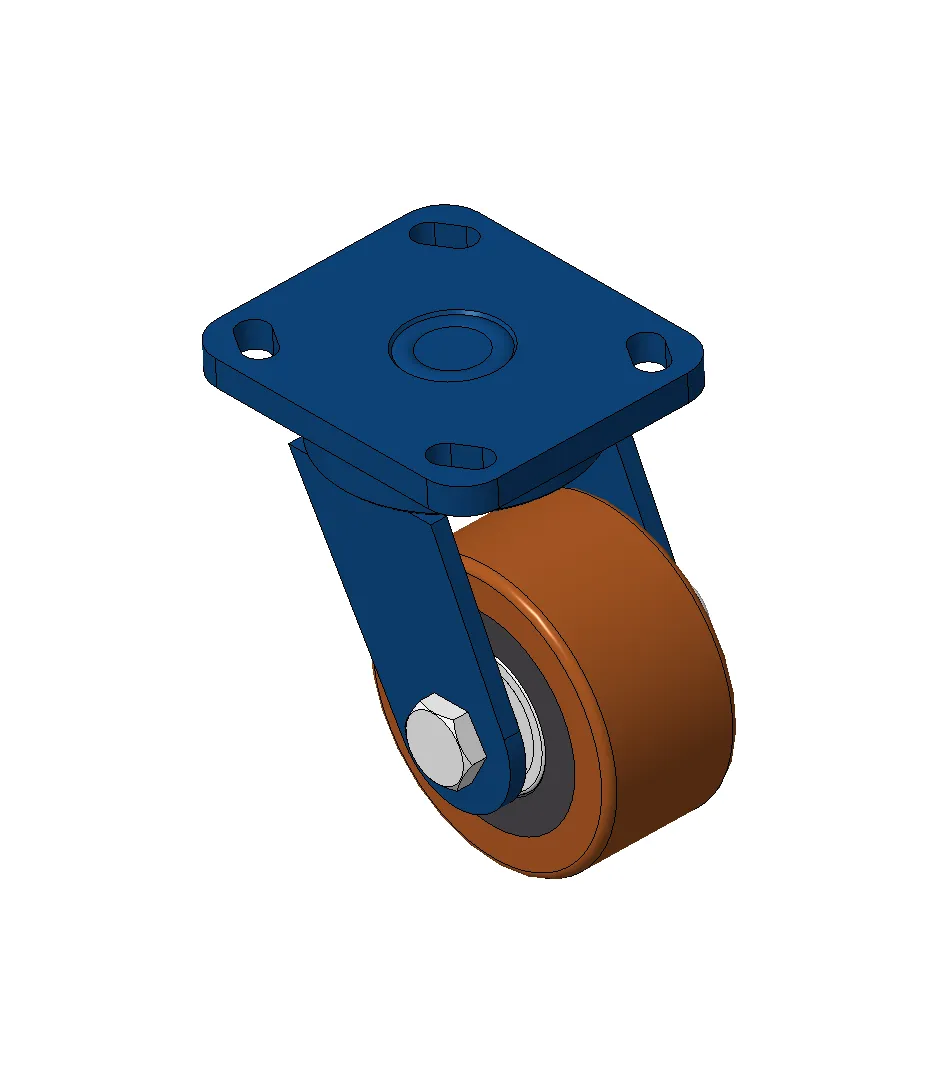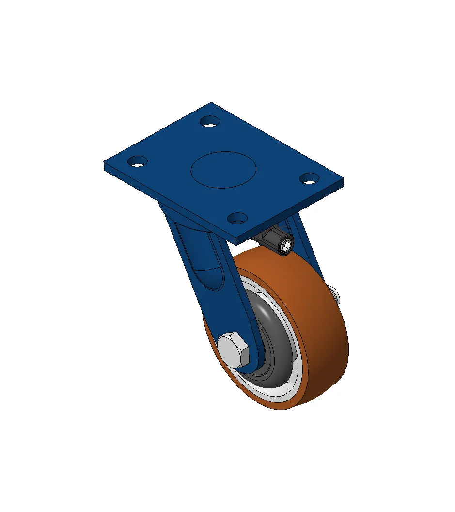 Swivel Caster with Welded Caster Fork and blue paint finish. Mounting Type - Top Plate, 110x75 Bolt Hole Spacing. Cast Iron Wheel Center with High Quality Polyurethane tread, Cast Iron brown. Bearing—Ball Bearing.