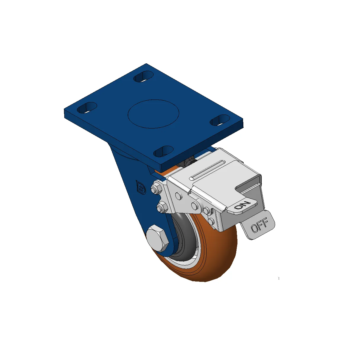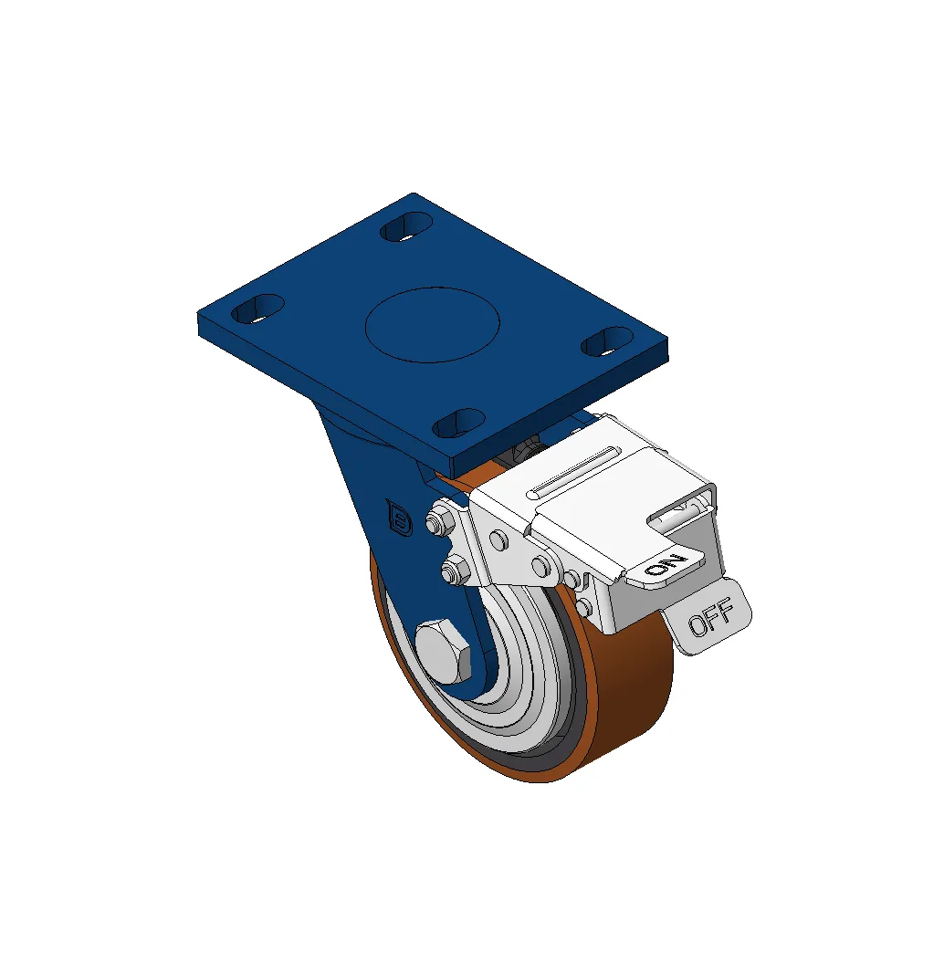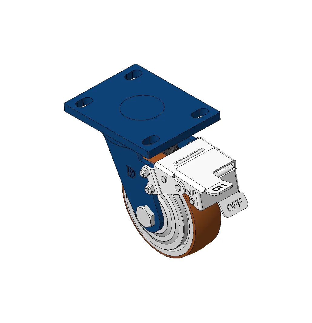 Front brake Caster with Self-Aligned Locking system, Welded Caster Fork Blue painted finish, Mounting Type - Top Plate, 110x75 Bolt Hole Spacing Cast Iron Wheel Center, High Quality Polyurethane tread, Cast Iron brown Bearing—Ball Bearing