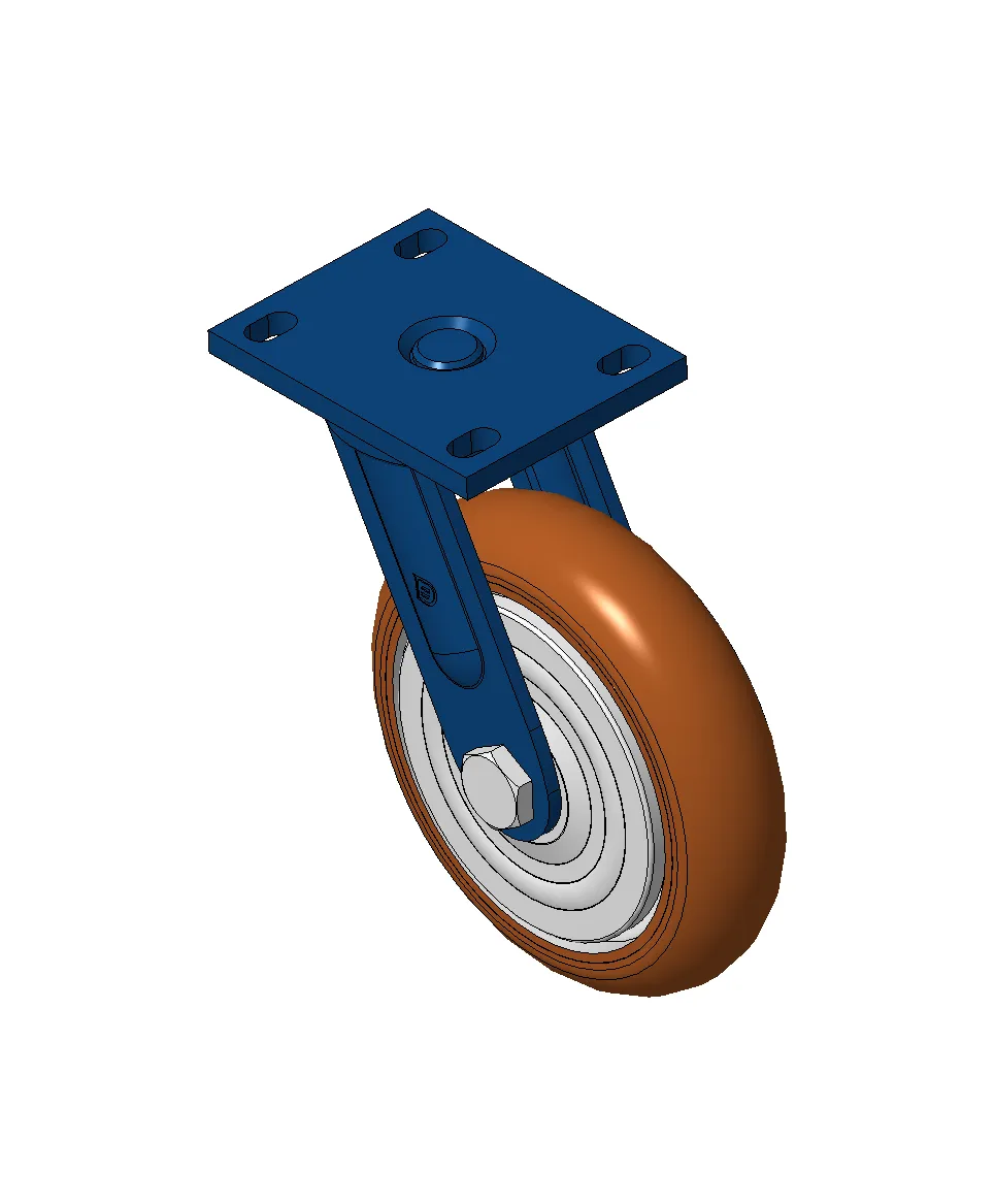 Swivel Caster with Welded Caster Fork and blue paint finish. Mounting Type - Top Plate, 110x75 Bolt Hole Spacing. Cast Iron Wheel Center with High Quality Polyurethane tread, Cast Iron brown. Bearing: Ball Bearing.