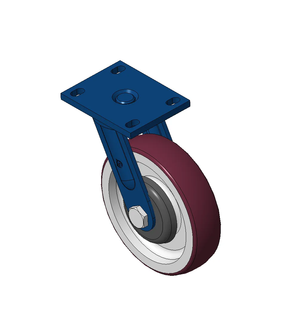 Swivel Caster with Welded Caster Fork and blue paint finish. Mounting Type - Top Plate, 110x75 Bolt Hole Spacing. Cast Iron Wheel Center with High Quality Polyurethane tread, burgundy color. Bearing: Ball Bearing.