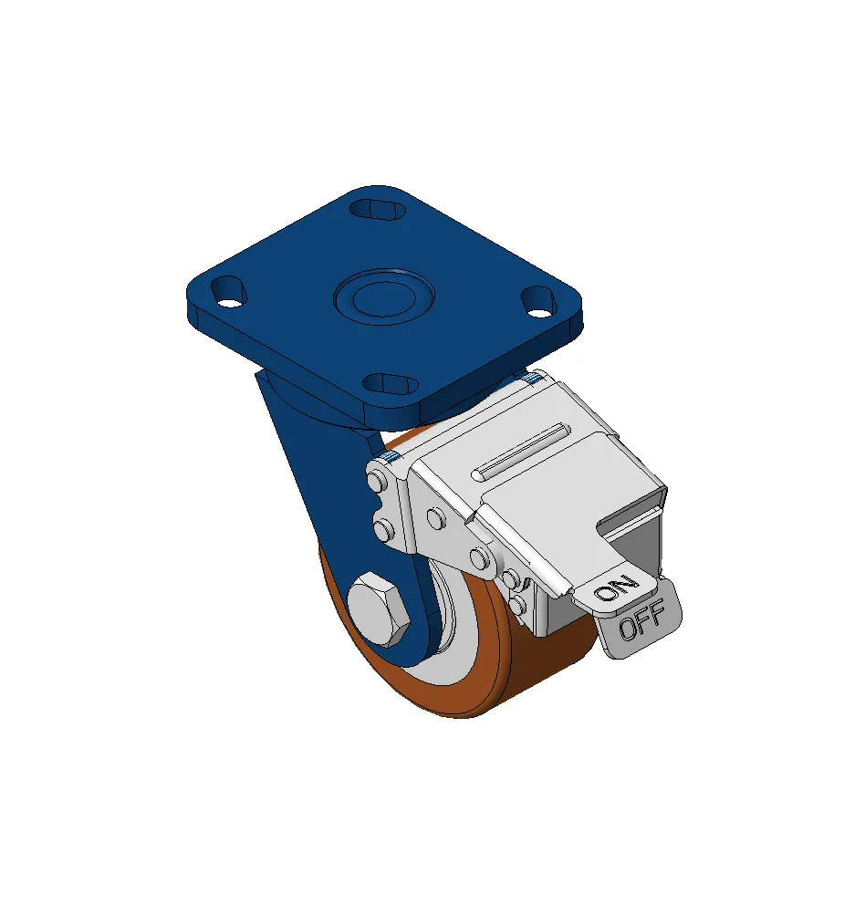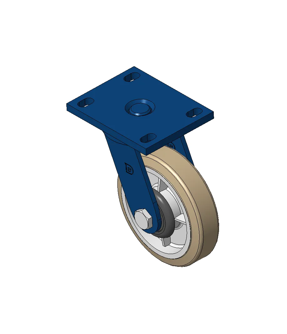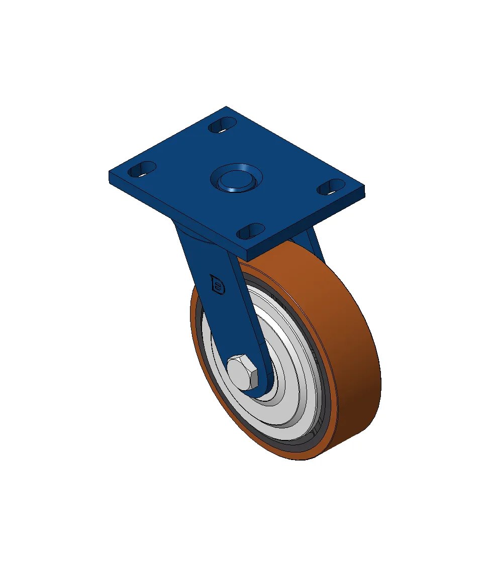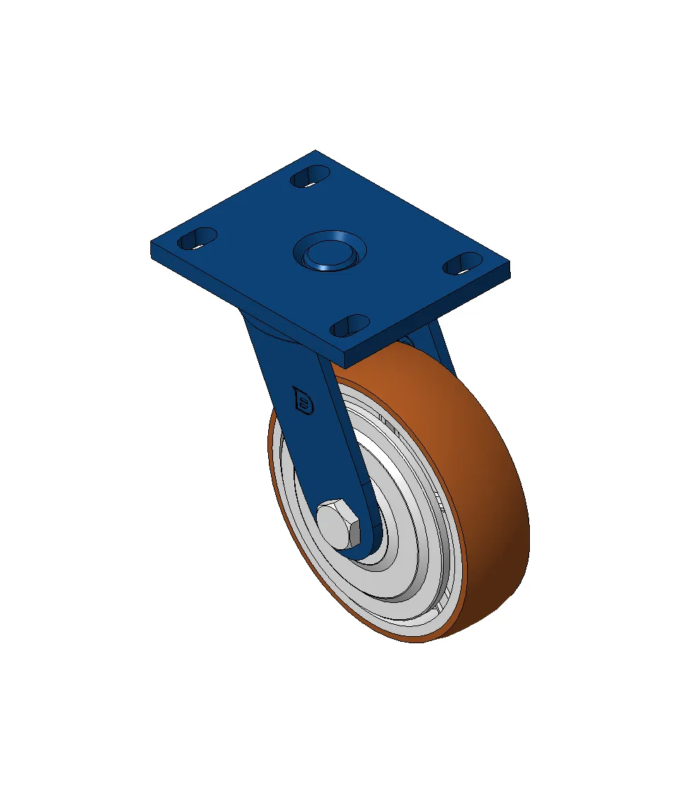 Swivel Caster with Welded Caster Fork, blue painted finish. Mounting Type - Top Plate, 110x75 Bolt Hole Spacing. Cast Iron Wheel Center with High Quality Polyurethane tread, Cast Iron brown. Bearing—Ball Bearing.
