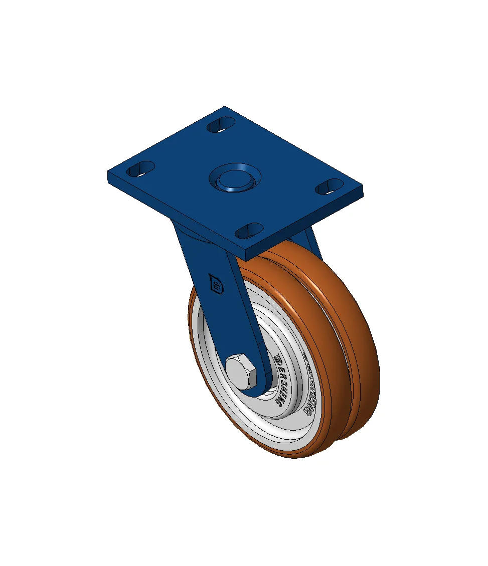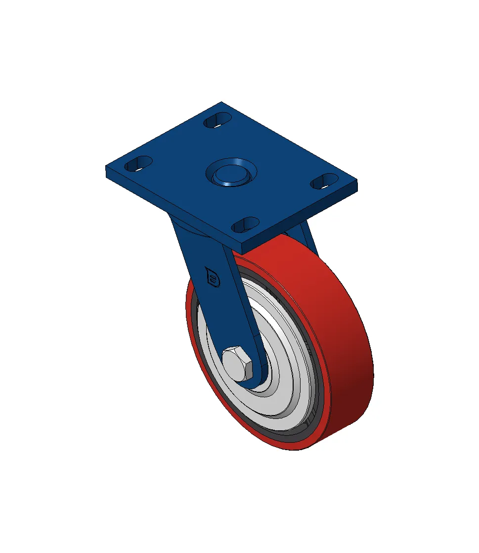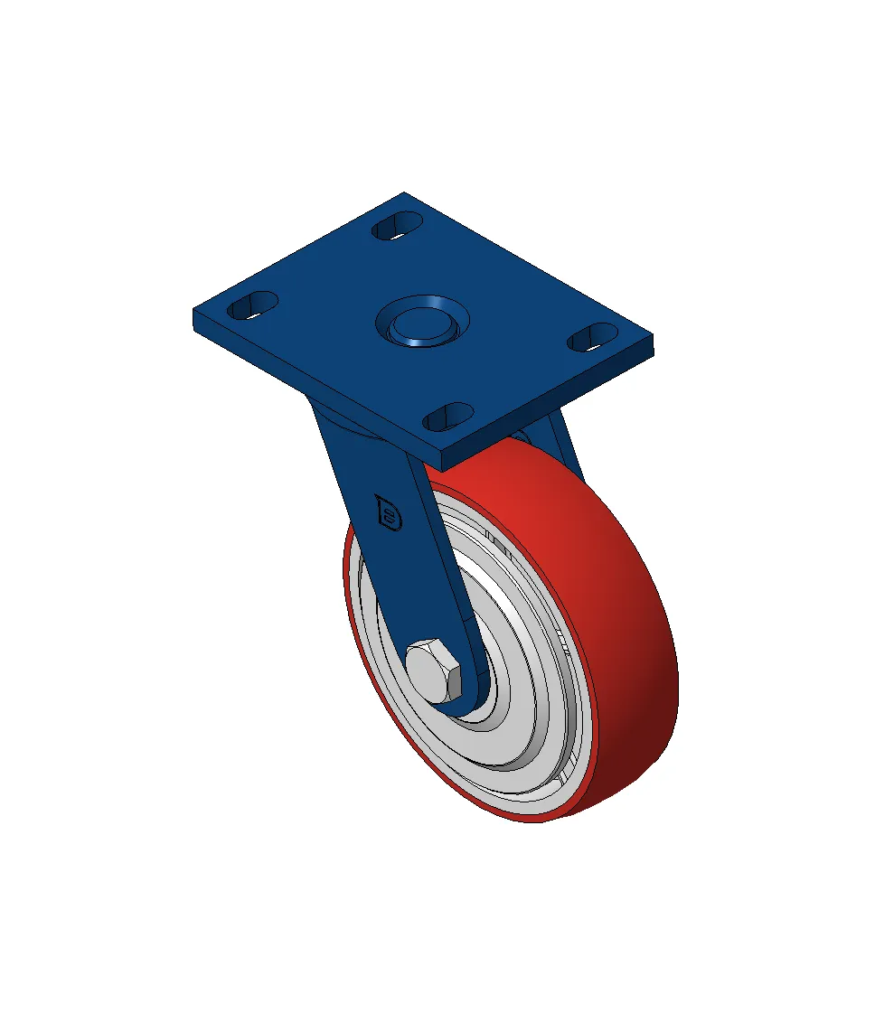 Swivel Caster with Welded Caster Fork, blue painted finish. Mounting Type - Top Plate, 110x75 Bolt Hole Spacing. Cast Iron Wheel Center with High Quality Polyurethane tread, Cast Iron red. Bearing—Ball Bearing.