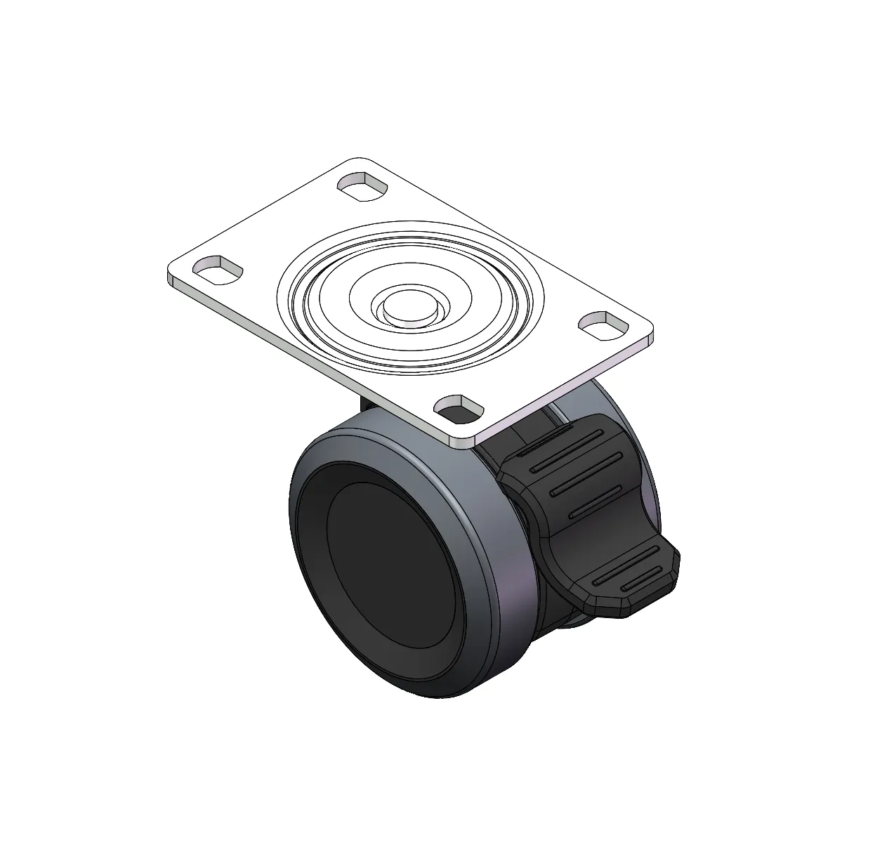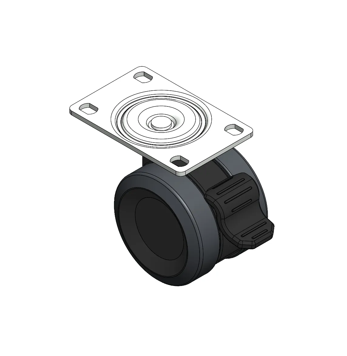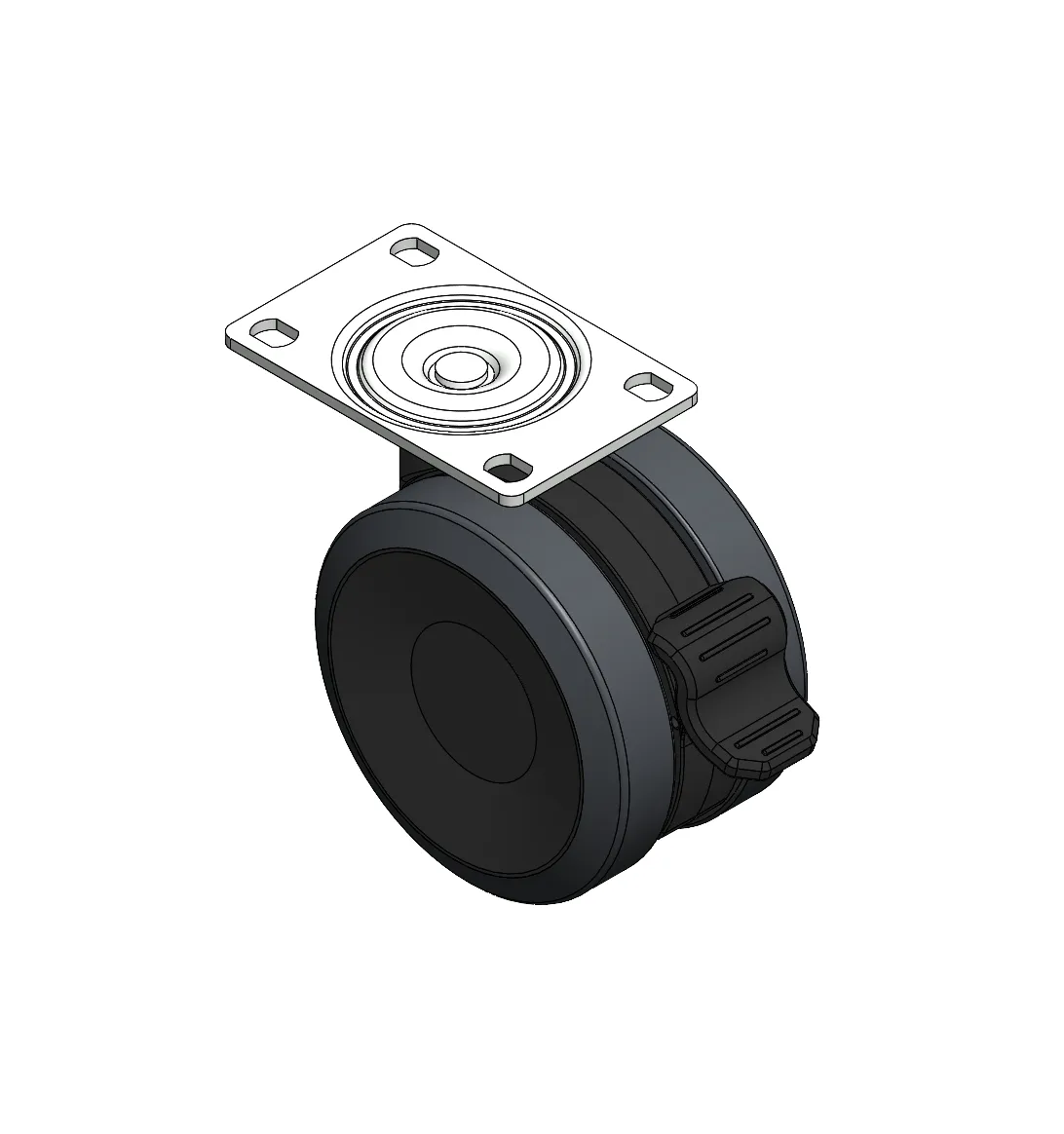 Swivel Caster with injection-molded Fork Riveted to Top Plate. reinforced Polypropylene Fork, Top Plate (3T) Mounting Type system Polypropylene (PP) core, polyvinyl chloride (PVC) tread Dark gray, Anti-thread wheel cover.