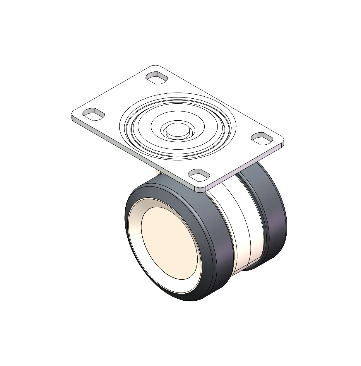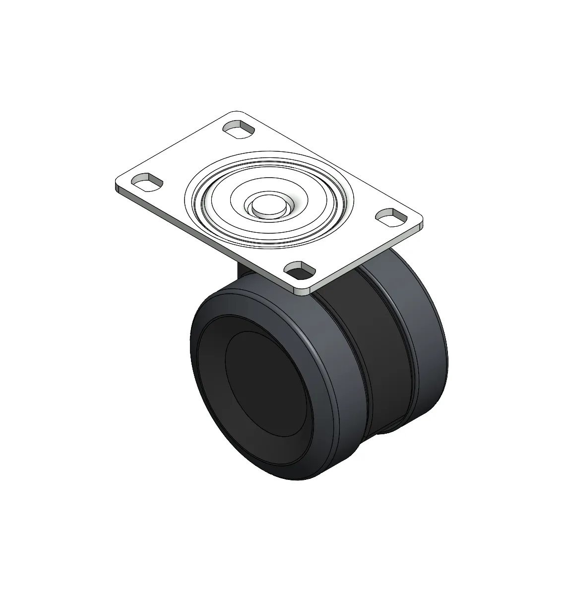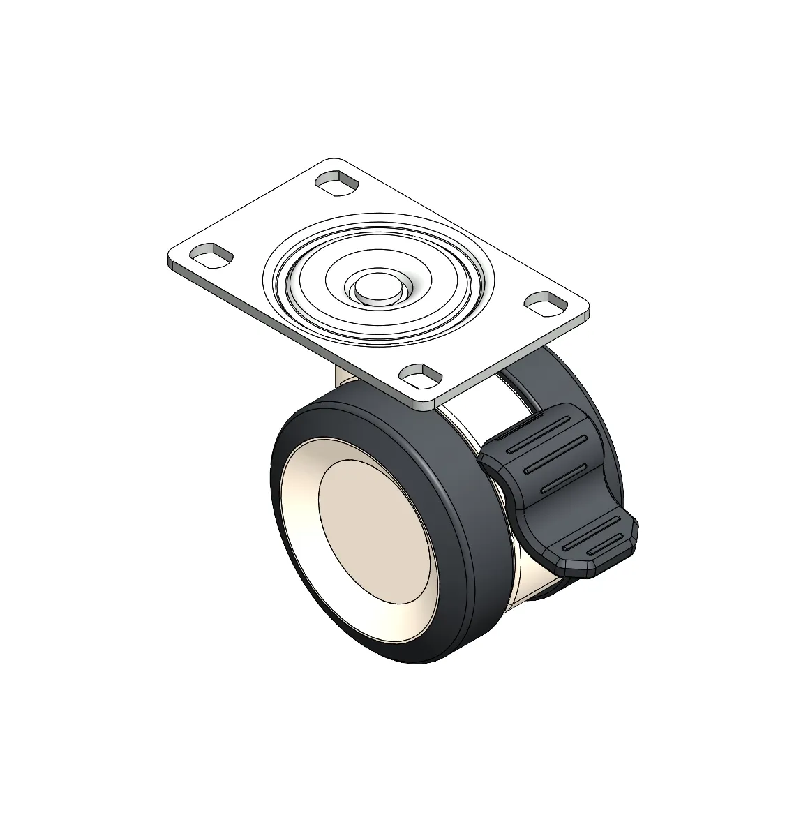 Swivel Caster with injection-molded Fork Riveted to Top Plate. reinforced Polypropylene Fork, Top Plate (3T) Mounting Type system Polypropylene (PP) core, polyvinyl chloride (PVC) tread Dark gray, Anti-thread wheel cover.