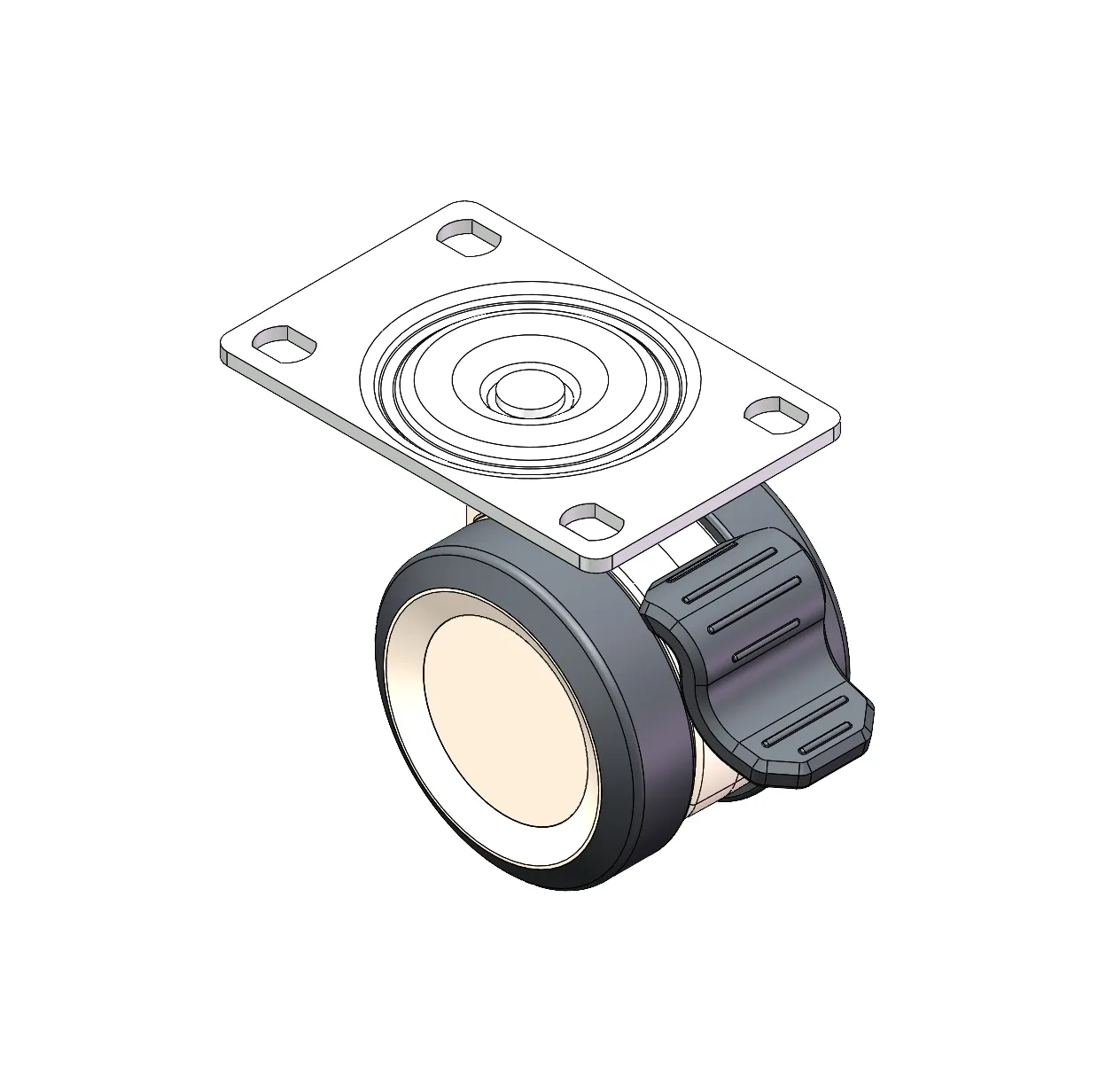 Single Brake locking system and a Fork-Riveted, injection-molded Fork. reinforced Polypropylene Fork with Fork-mount (3T) Mounting Type system Polypropylene (PP) Wheel Center, polyvinyl chloride (PVC) tread White-dark gray, wheel - Plain Bearing.