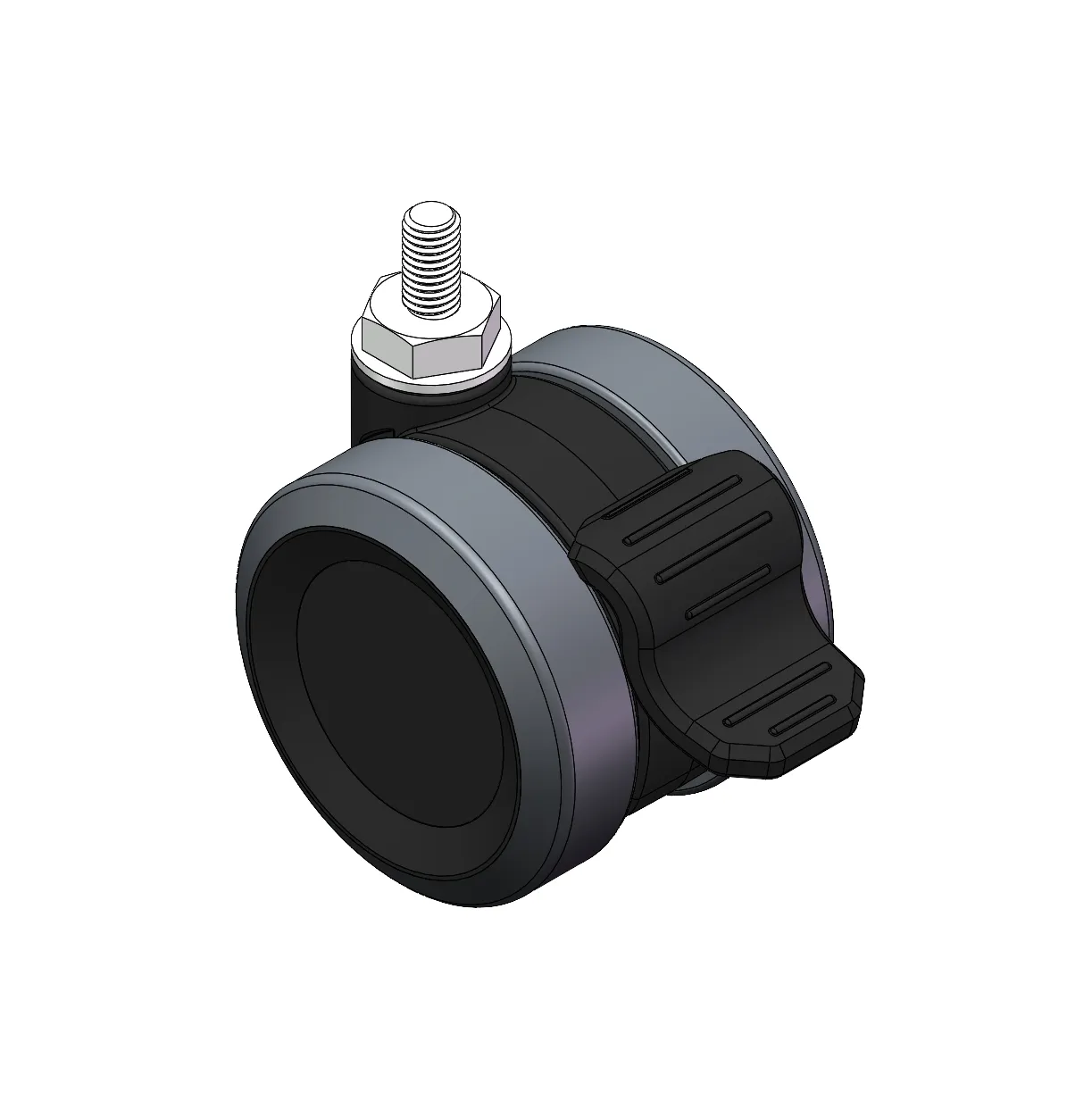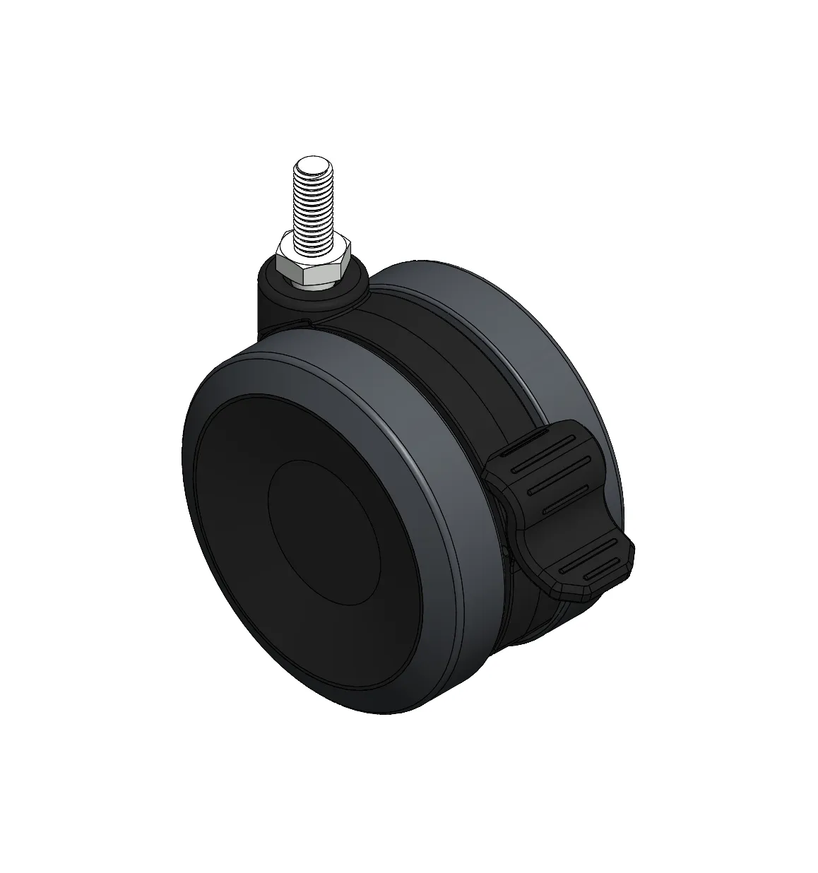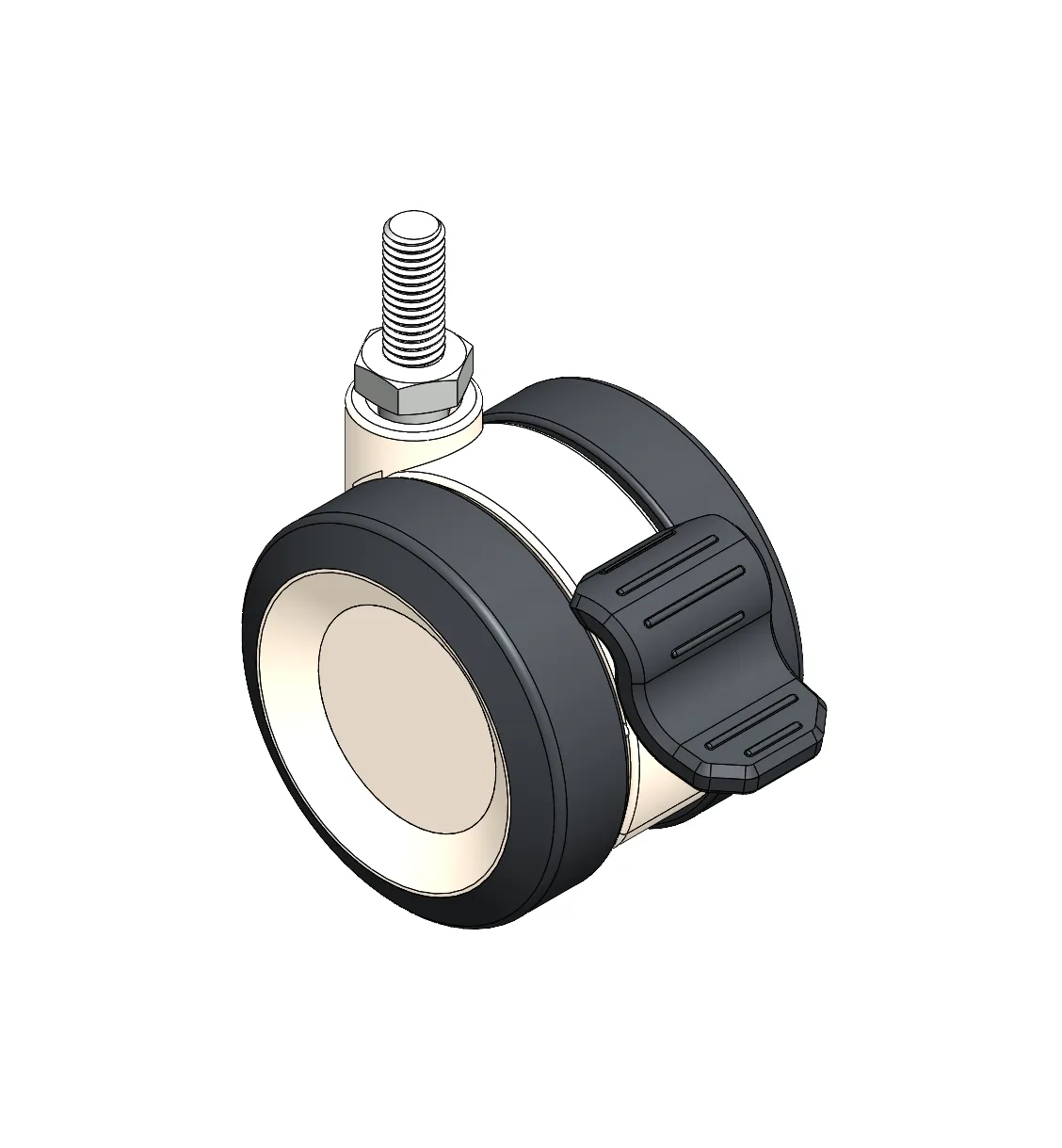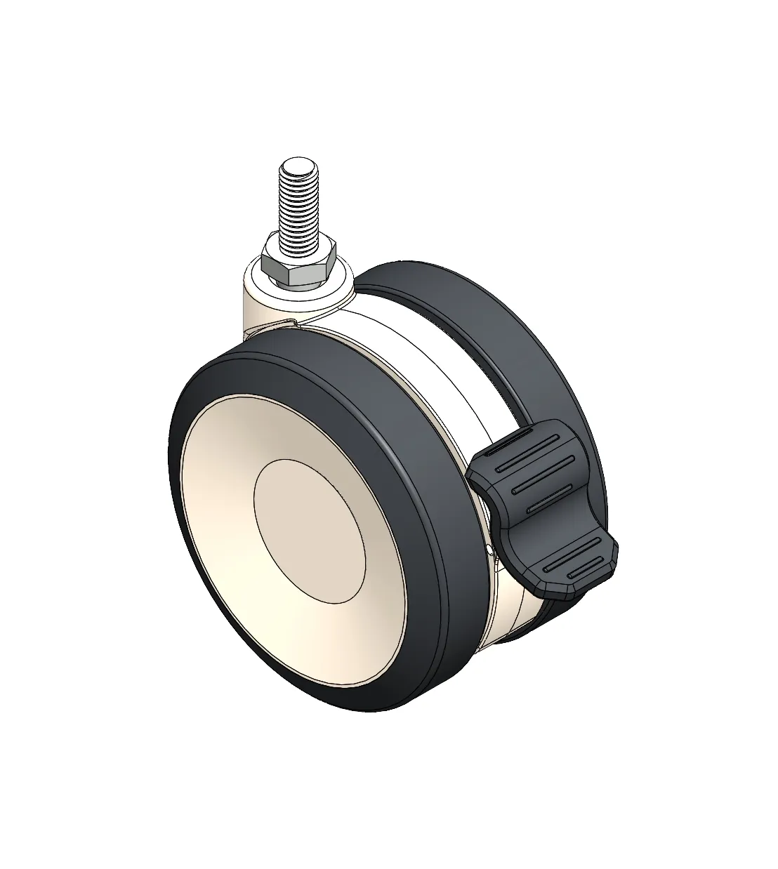 Caster with a single-brake With locking system, thread-Riveted, Injection Molding Fork (3/8"-16). reinforced Polypropylene Fork, Mounting Type - Threaded Stem. Polypropylene (PP) core, polyvinyl chloride (PVC) Wheel Tread. White-dark gray. Bearings: Ball Bearings.