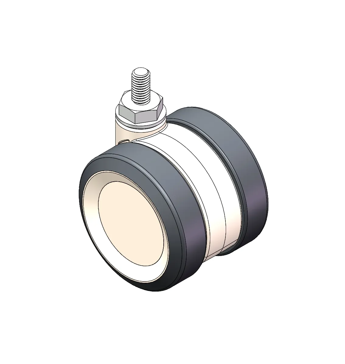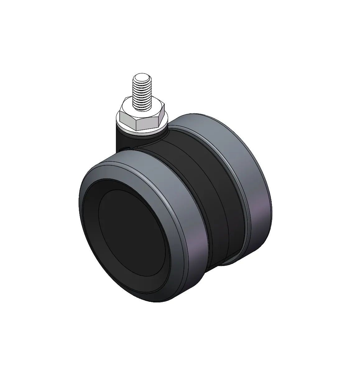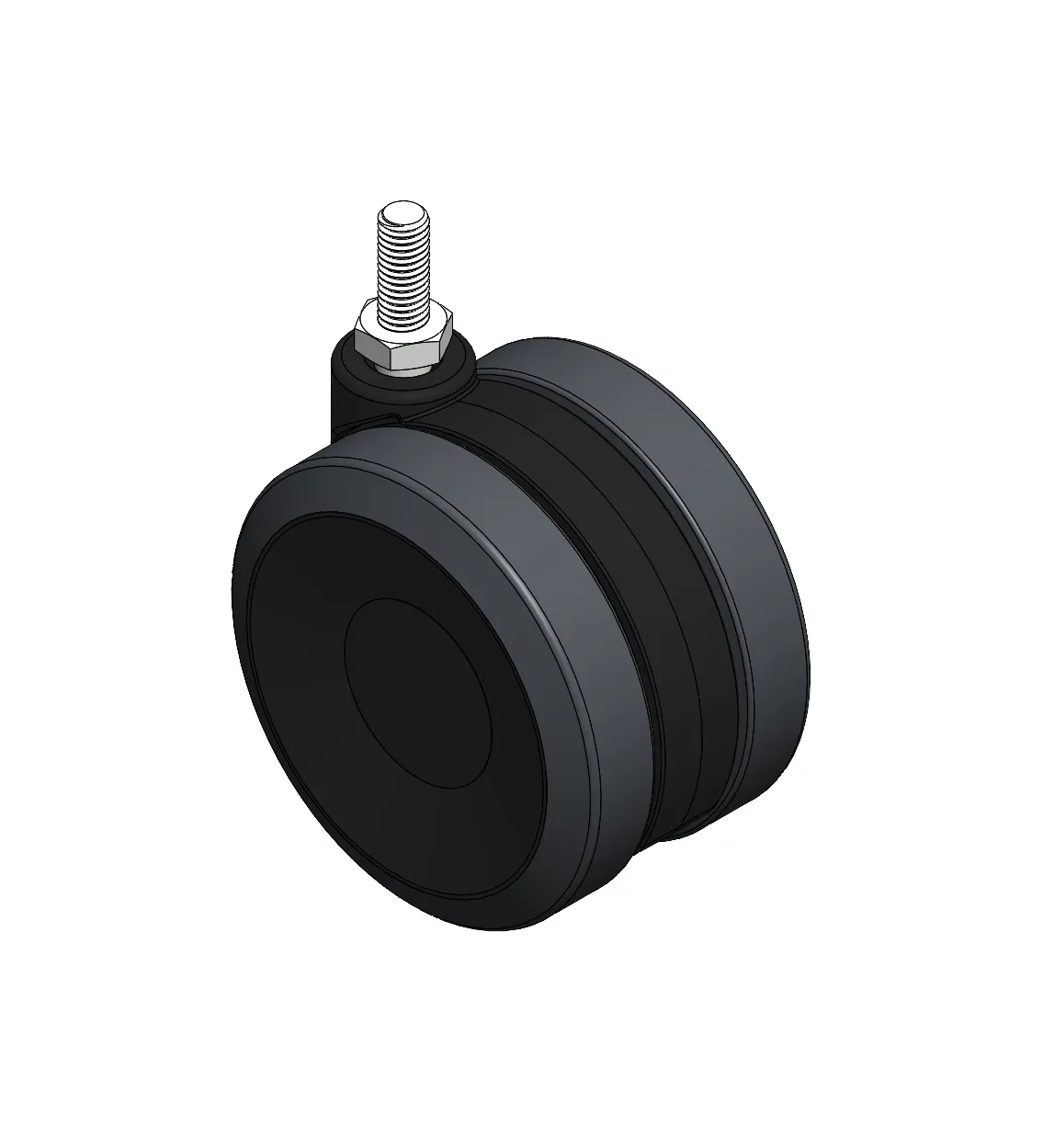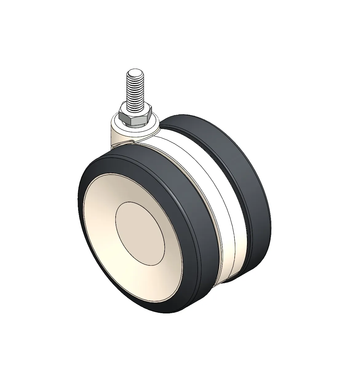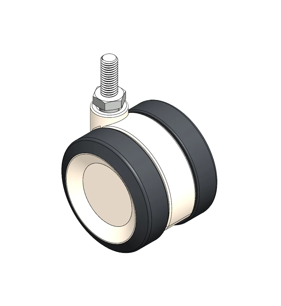 Caster with a single-brake With locking system, thread-Riveted, Injection Molding Fork (3/8"-16). reinforced Polypropylene Fork, Mounting Type - Threaded Stem. Polypropylene (PP) core, polyvinyl chloride (PVC) Wheel Tread. White-dark gray. Bearings: Ball Bearings.
