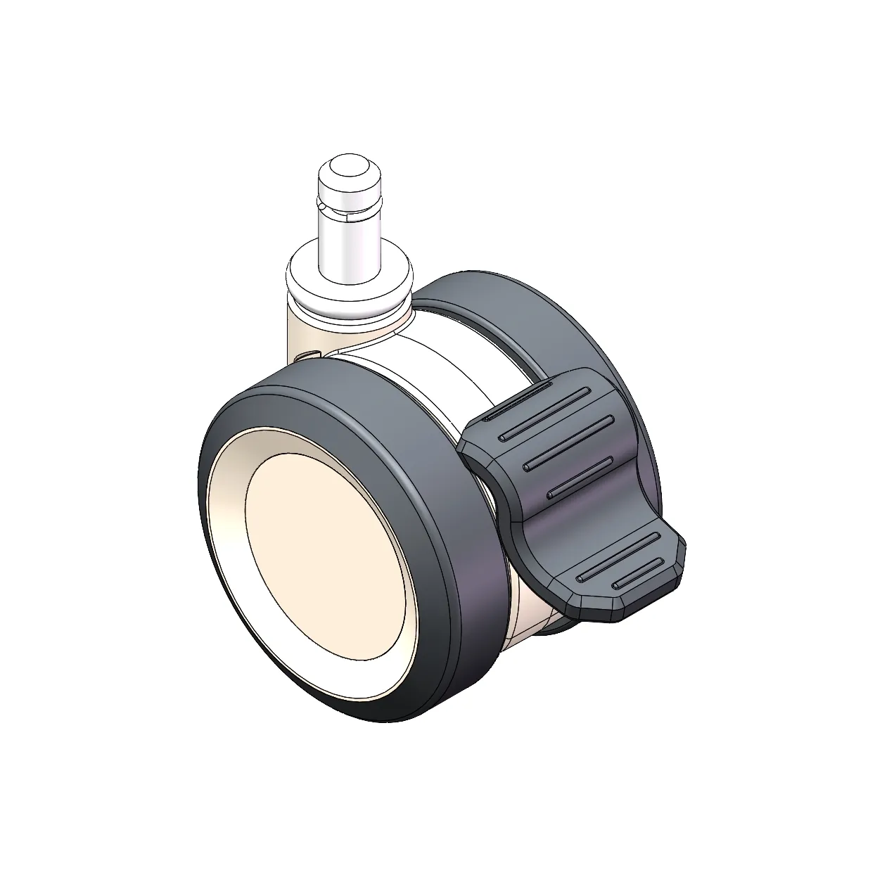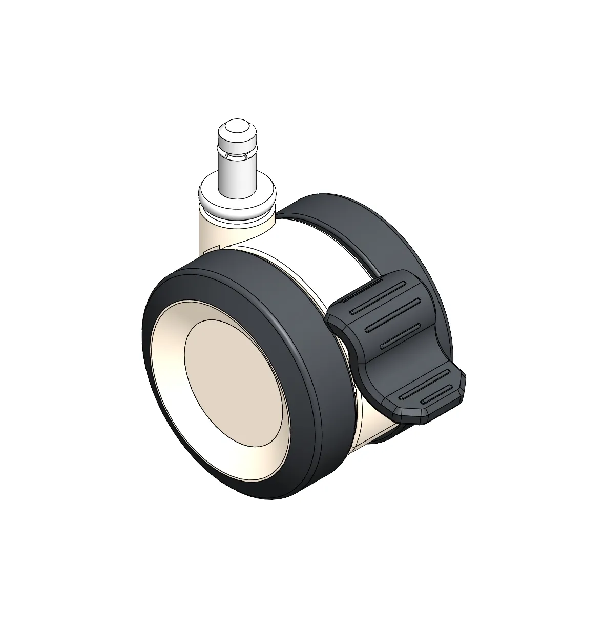 Single Brake locking system, insert-Riveted, injection-molded Fork (Ø 11 x 22L). reinforced Polypropylene Fork, insert-type Mounting Type mechanism. Polypropylene (PP) core, polyvinyl chloride (PVC) tread. White-dark gray, wheel with Plain Bearing design.