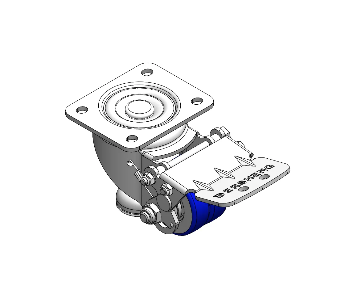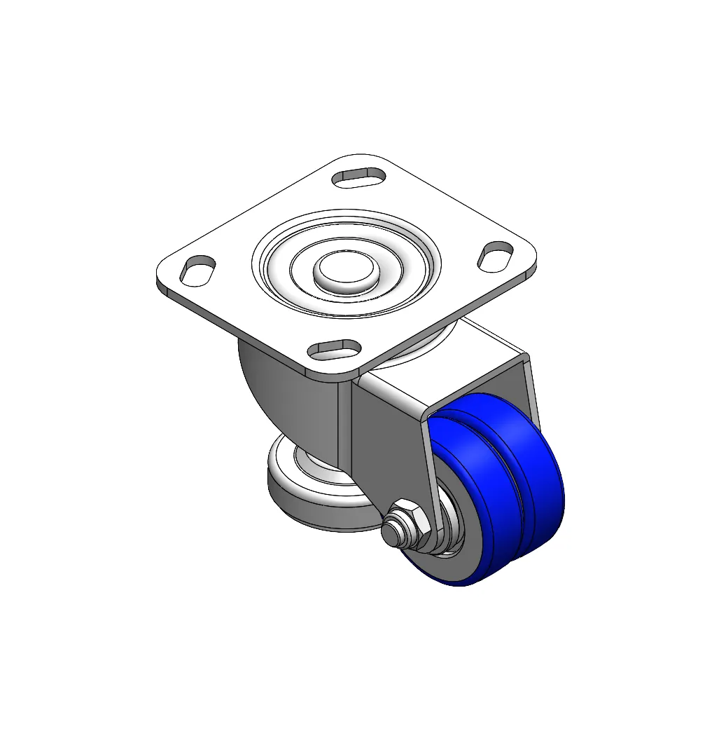 Swivel Caster with Riveted Fork and Stamping Fork—D-shaped hole. Zine-Plated, Fork-mounted (4T) Mounting Type mechanism with Height Adjustable Stand. Cast Iron Wheel Center with High Quality Polyurethane tread. Blue color. Bearing—Ball Bearing.