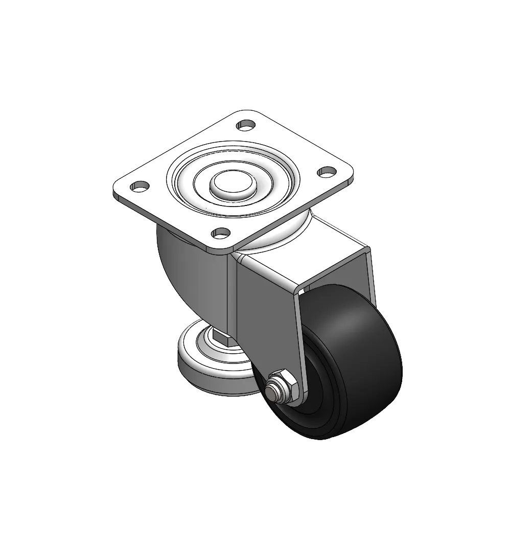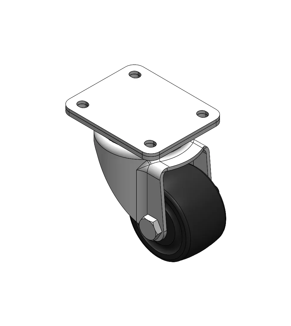 Swivel Caster with Riveted Fork and Stamping bracket—European standard holes. Zine-Plated, Mounting Type - Top Plate, Height Adjustable Stand. Reinforced Polypropylene and tread. Black, Bearing—Ball Bearing.
