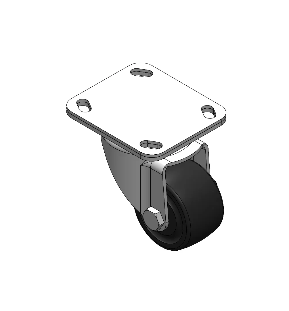 Swivel Caster with Riveted Fork and Stamping Fork—D-shaped hole. Zine-Plated, Fork-mount Mounting Type. Reinforced Polypropylene and tread. Black. Bearing—Ball Bearing.