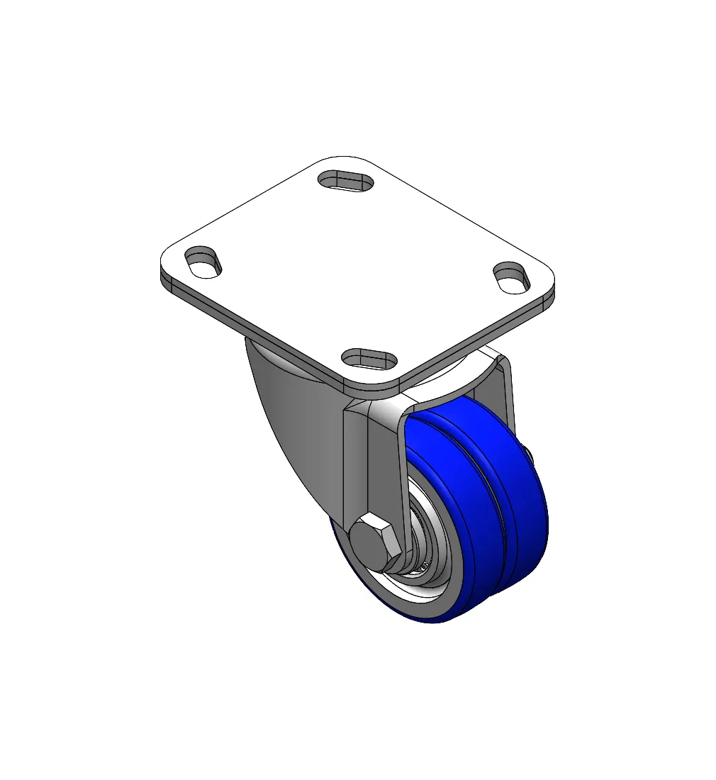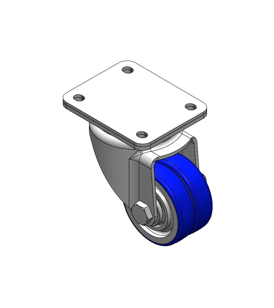 Swivel Caster with Riveted Fork and Stamping Fork with 85 x 70mm (3-3/8" x 2-3/4") Bolt Hole Spacing. Zine-Plated, Mounting Type - Top Plate. Cast Iron Wheel Center with High Quality Polyurethane tread. Blue color. Bearing: Ball Bearing.