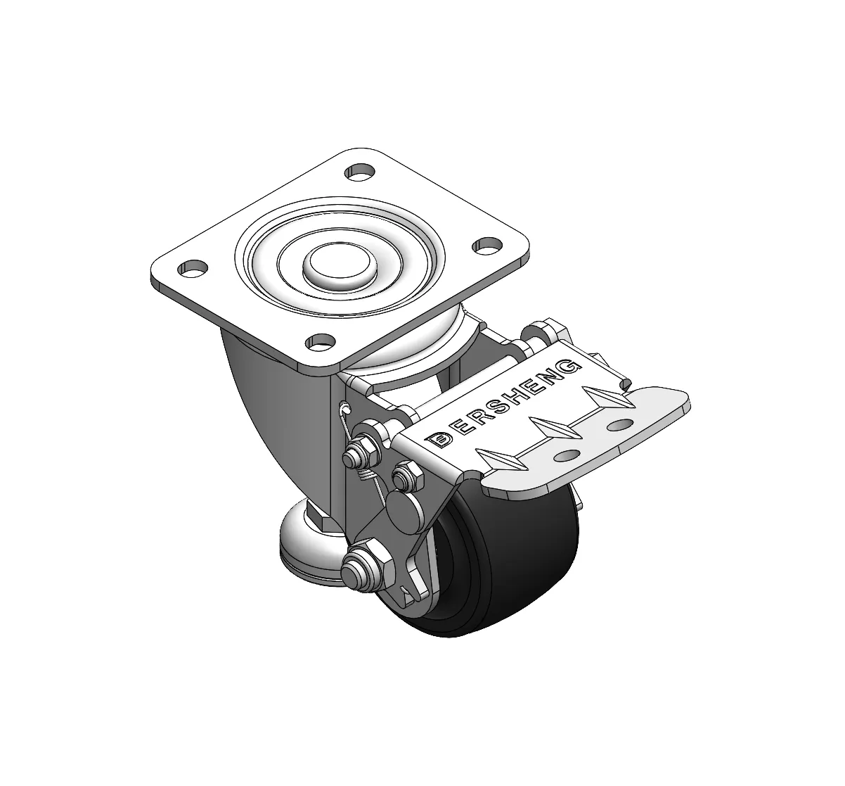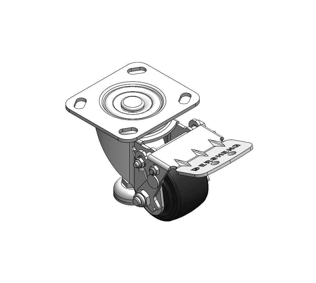 Adjustable lift Caster with Riveted, Stamping Fork 85 x 70mm (3-3/8" x 2-3/4") Bolt Hole Spacing and Long Pedal. Zine-Plated, Mounting Type - Top Plate, and adjustable support. Reinforced Polypropylene and tread. Black, Bearing with Ball Bearing.