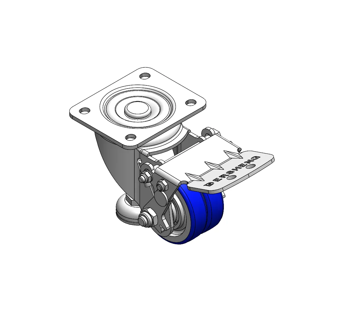 Height Adjustable Leveling Caster, Top Plate with Riveted Fork and European standard holes, Short Pedal Zine-Plated, Mounting Type - Top Plate, Height Adjustable Stand Cast Iron Wheel Center with High Quality Polyurethane tread Blue color, Bearing with Ball Bearing.