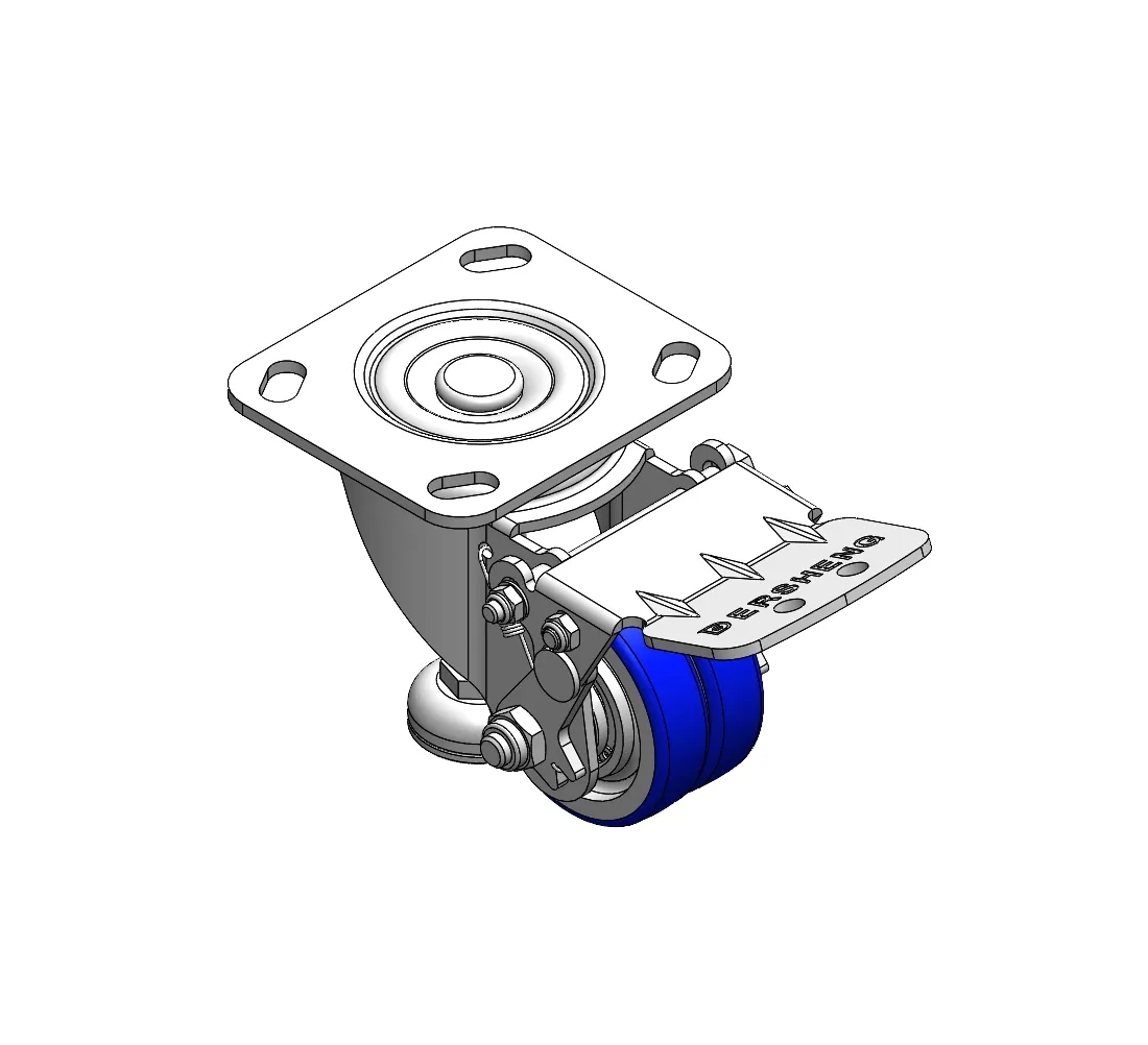 Height Adjustable Leveling Caster, Top Plate with Riveted Fork and 85 x 70mm (3-3/8" x 2-3/4") Bolt Hole Spacings, Long Pedal Zine-Plated, Mounting Type - Top Plate, Height Adjustable Stand Cast Iron Wheel Center with High Quality Polyurethane tread Blue color, Bearing with Ball Bearing.