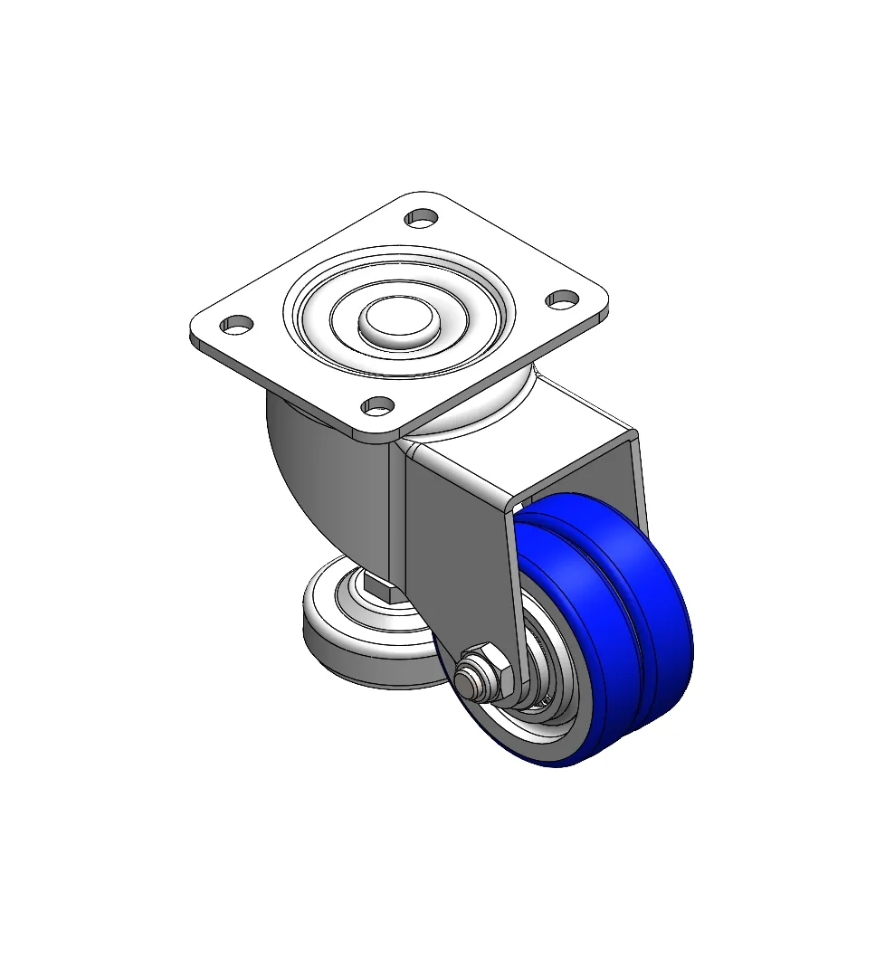 Swivel Caster with Riveted, Stamping Fork 44.5 x 30mm (1-3/4" x 1-1/8") Bolt Hole Spacing. Zine-Plated, Mounting Type - Top Plate, Height Adjustable Stand. Cast Iron Wheel Center with High Quality Polyurethane tread. Blue color. Bearing: Ball Bearing.