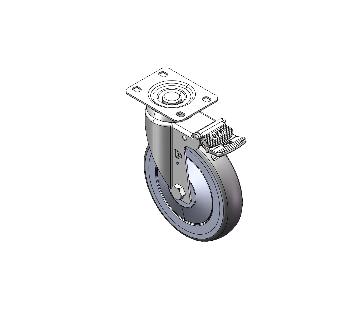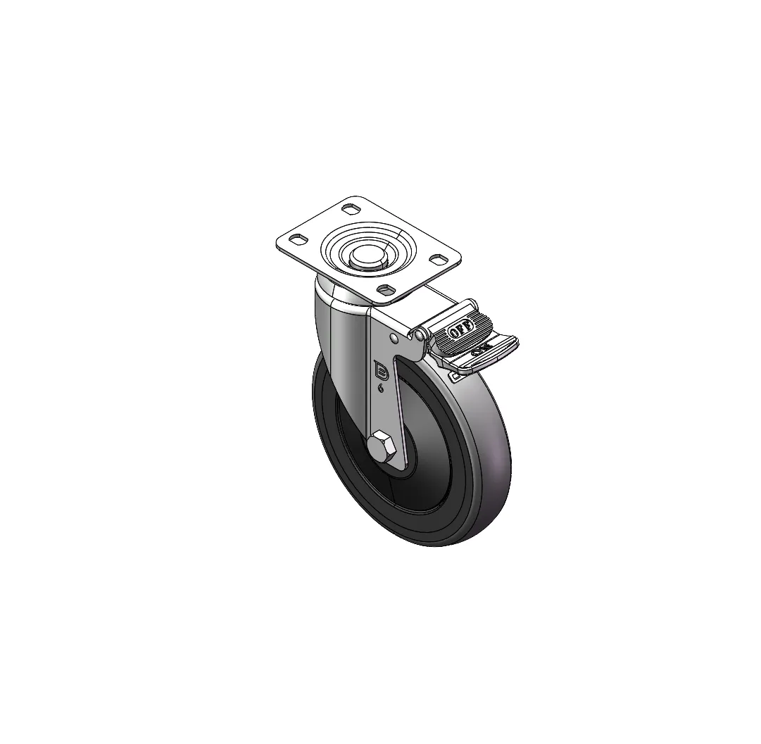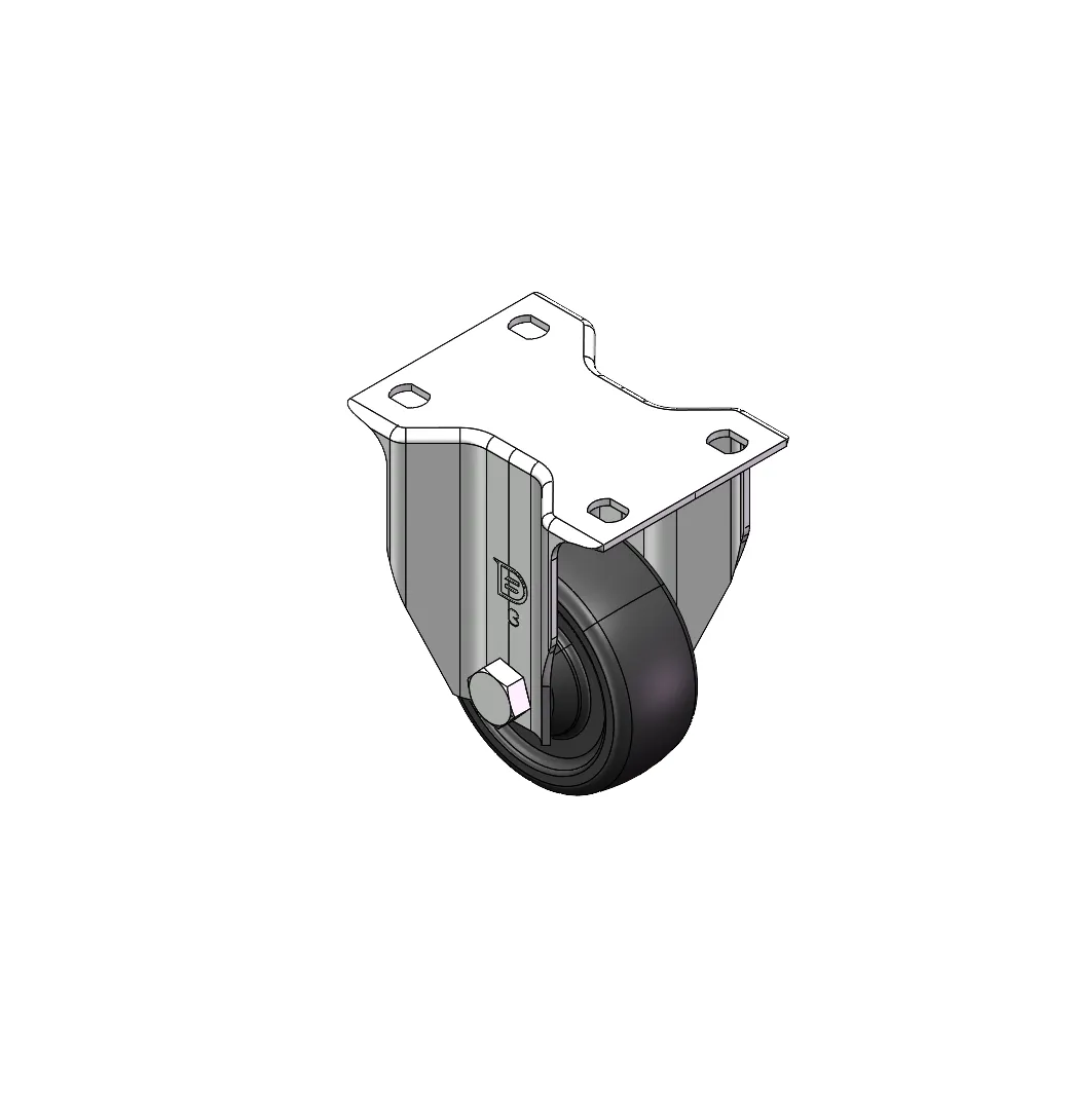 Rigid Caster, Stamping Fabricated Caster Fork - 75 x 45 mm (3" x 1-3/4") Bolt Hole Spacing Extended control lever surface, Mounting Type - Top Plate Reinforced Polypropylene, High-Quality Resilient Rubber Wheel Tread Wheel - Plain Bearing