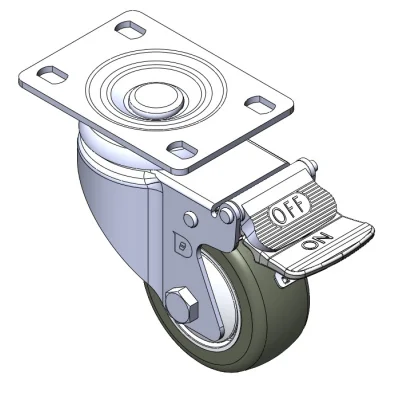 Casters with a single-brake With locking system. Top Plate with Riveted, Stamping Fork and 85 x 70mm (3-3/8" x 2-3/4") Bolt Hole Spacings.