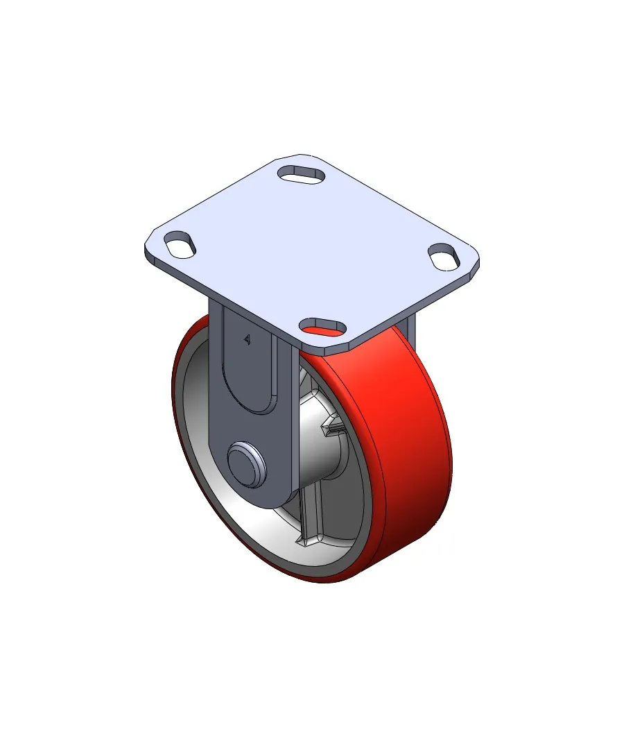 Rigid Caster with Welded Caster Fork Zine-Plated, Mounting Type - Top Plate (for 4-inch Fork) Cast Iron core with High Quality Polyurethane Wheel Tread Red Cast Iron finish, Bearing—Annual Ball Bearings.