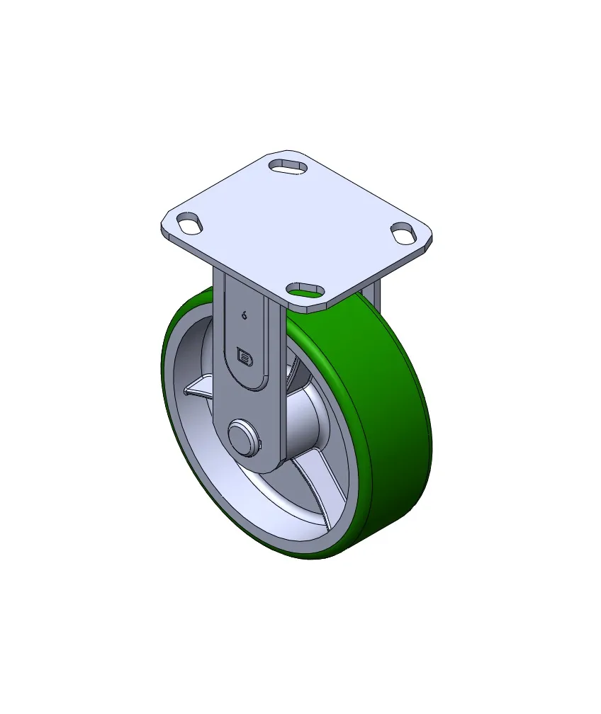 Rigid Caster with Welded Caster Fork Zine-Plated, Mounting Type - Top Plate Cast Iron core with High Quality Polyurethane Wheel Tread Green color, Bearing—Annual Ball Bearings.
