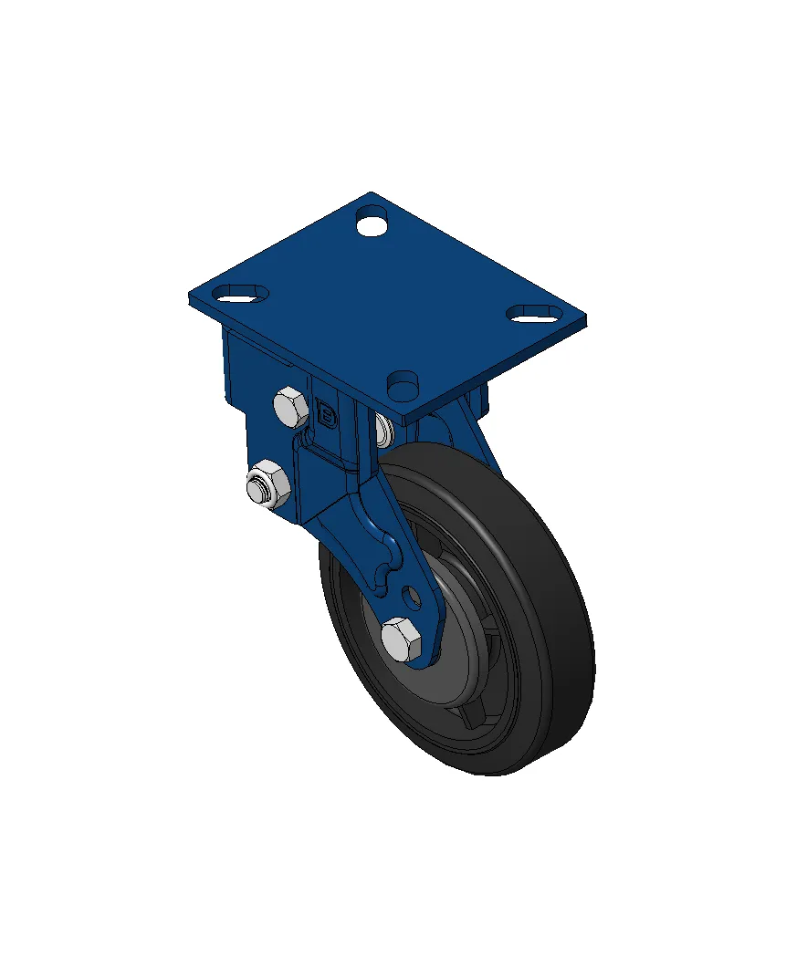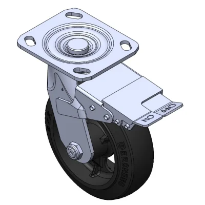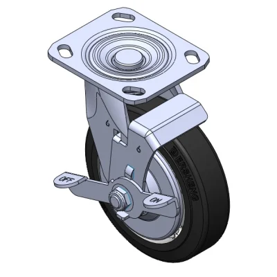 Casters with front brake and With locking system. Welded Caster Fork. Zine-Plated. Mounting Type - Top Plate. Cast Iron Wheel Center with High-Quality Resilient Rubber Wheel Tread. Black. Bearings—Annual Ball Bearings.