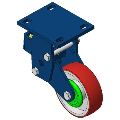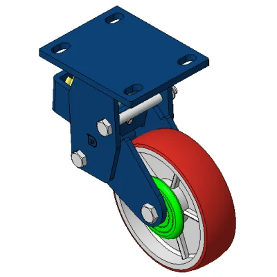 Rigid Spring-loaded Caster with Welded Caster Fork Blue painted finish, Mounting Type - Top Plate, 110x75 Bolt Hole Spacing Cast Iron core with High Quality Polyurethane Wheel Tread Red Cast Iron finish, Bearing – Ball Bearings