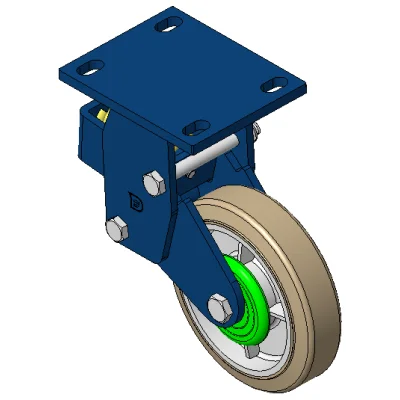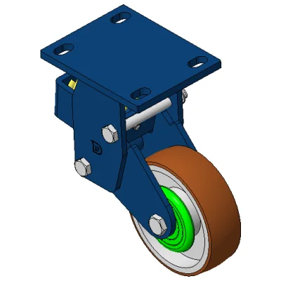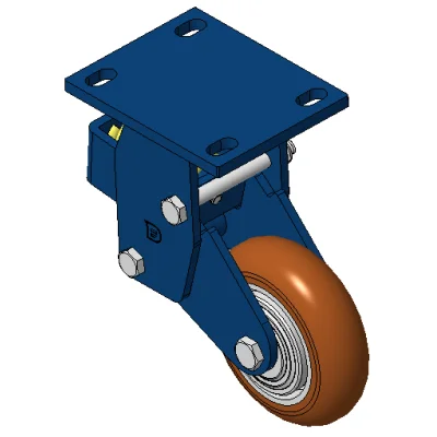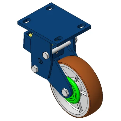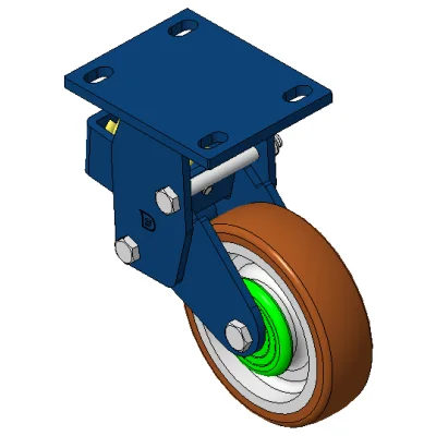 Rigid Spring-loaded Caster with Welded Caster Fork Blue painted finish, Mounting Type - Top Plate, 110x75 Bolt Hole Spacing Cast Iron core with High Quality Polyurethane Wheel Tread Cast Iron brown, Bearing – Ball Bearings