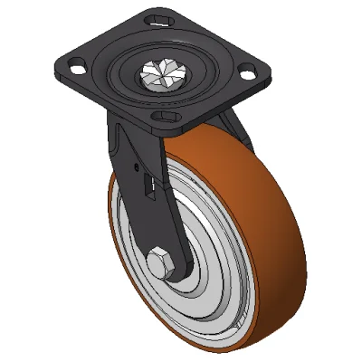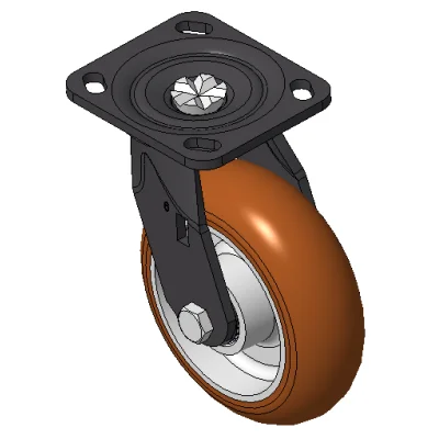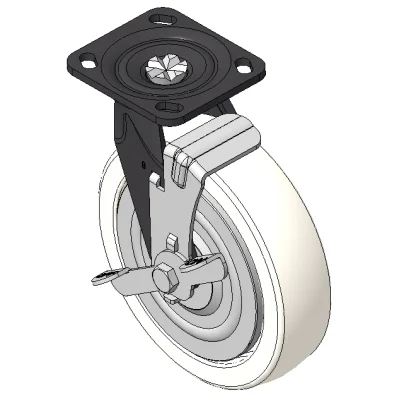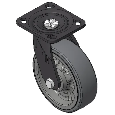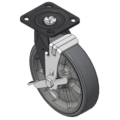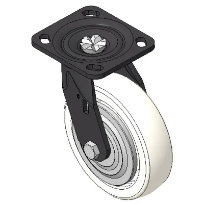 Side-brake Casters, Welded Caster Fork, black paint finish. Base plate Mounting Type, 85x70mm Bolt Hole Spacing. Reinforced Polypropylene (PA6), natural finish. Bearings—Ball Bearings, with metal caps.