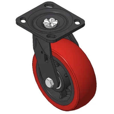 Side-brake Casters, Welded Caster Fork, black paint finish. Base plate Mounting Type device, 85x70mm Bolt Hole Spacing. Reinforced Polypropylene rubber elastomer (TPR), Cast Iron red. Bearings—Ball Bearings.