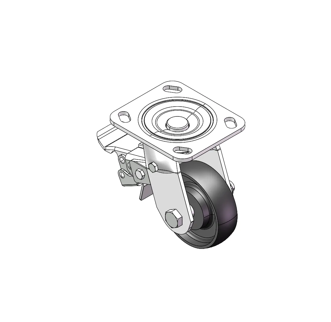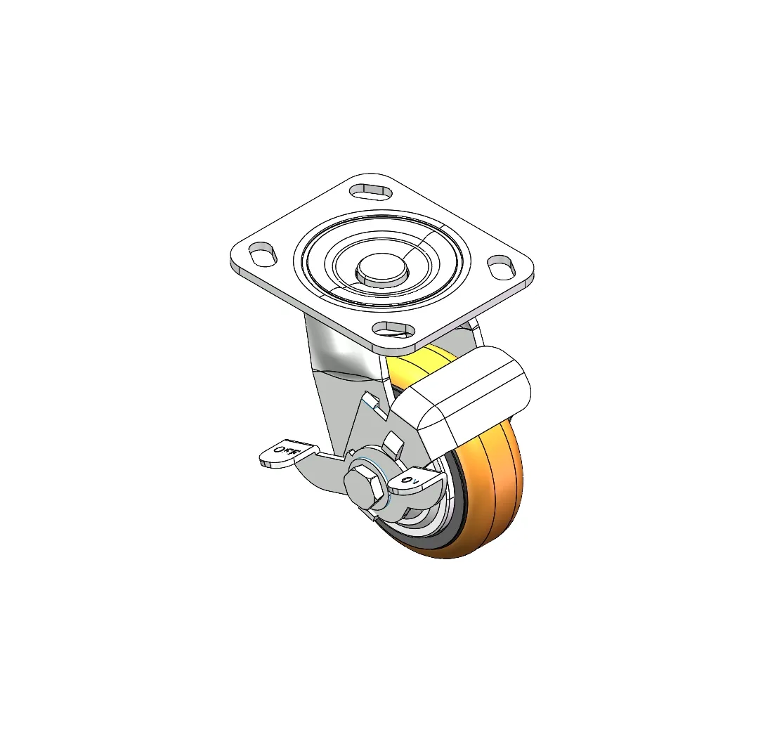 Side (wheel) brake Caster with Locking system. Top Plate Riveted and Stamping Forkplate – D-shaped hole Zine-Plated, Top Plate (4.5T) Mounting Type system Cast Iron Wheel Center with High Quality Polyurethane tread Iron black, Bearing – Ball Bearing