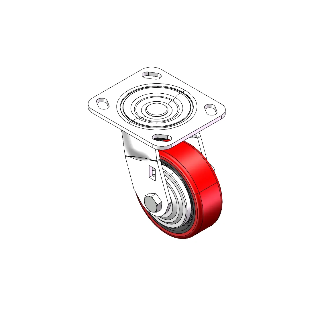 Swivel Caster with Riveted Fork and Stamping Fork - 85 x 70mm (3-3/8" x 2-3/4") Bolt Hole Spacing Zine-Plated, Fork-mounted (4.5T) Mounting Type system Cast Iron Wheel Center with High Quality Polyurethane tread Red Cast Iron finish, Bearing - Ball Bearing.