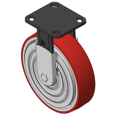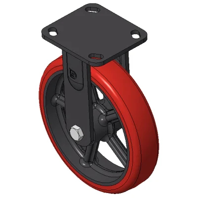 Rigid Casters, Welded Caster Fork, black painted finish. Base plate Mounting Type device, 85x70mm Bolt Hole Spacing. Cast Iron Wheel Center, High Quality Polyurethane Wheel Tread, Cast Iron red. Bearings—Ball Bearings.