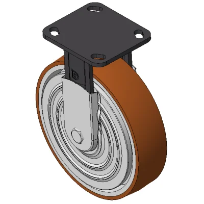 Rigid Casters, Welded Caster Fork, black paint finish. Base plate Mounting Type device, 85x70mm Bolt Hole Spacing. Cast Iron Wheel Center, High Quality Polyurethane Wheel Tread, Cast Iron brown. Bearings—Ball Bearings, with iron caps.