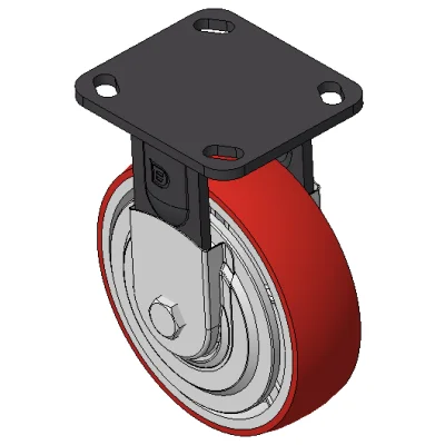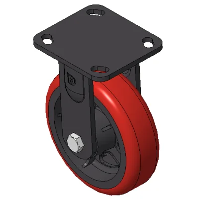 Rigid Casters, Welded Caster Fork, black painted finish. Base plate Mounting Type device, 85x70mm Bolt Hole Spacing. Cast Iron Wheel Center, High Quality Polyurethane Wheel Tread, Cast Iron red. Bearings—Ball Bearings.