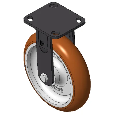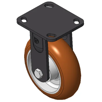 Rigid Casters, Welded Caster Fork, black paint finish. Base plate Mounting Type, 85x70mm Bolt Hole Spacing. Cast Iron Wheel Center, High Quality Polyurethane Wheel Tread, Cast Iron brown. Bearings—Ball Bearings.