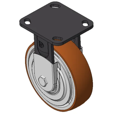 Rigid Casters, Welded Caster Fork, black paint finish. Base plate Mounting Type device, 85x70mm Bolt Hole Spacing. Cast Iron Wheel Center, High Quality Polyurethane Wheel Tread, Cast Iron brown. Bearings—Ball Bearings, with iron caps.