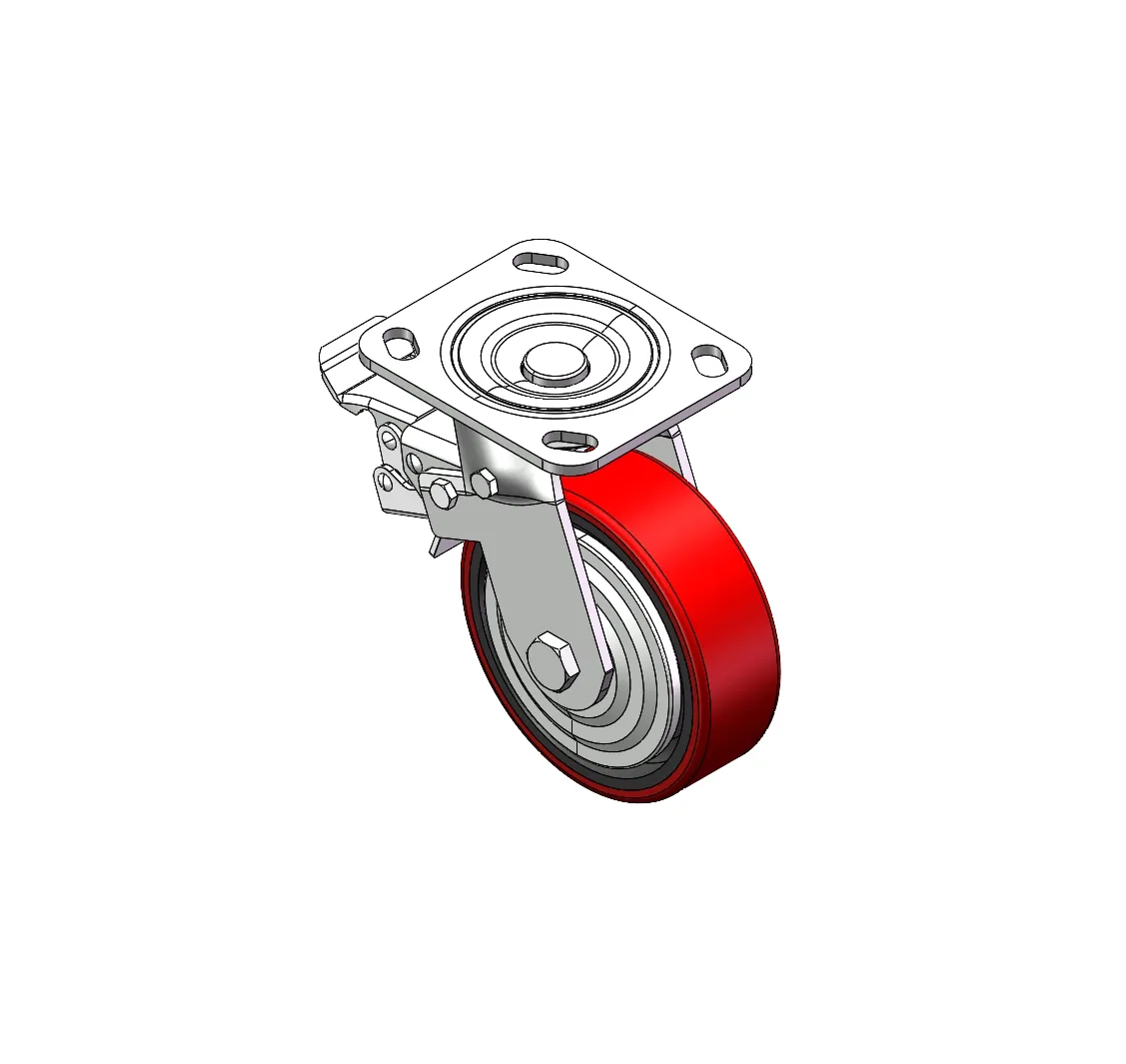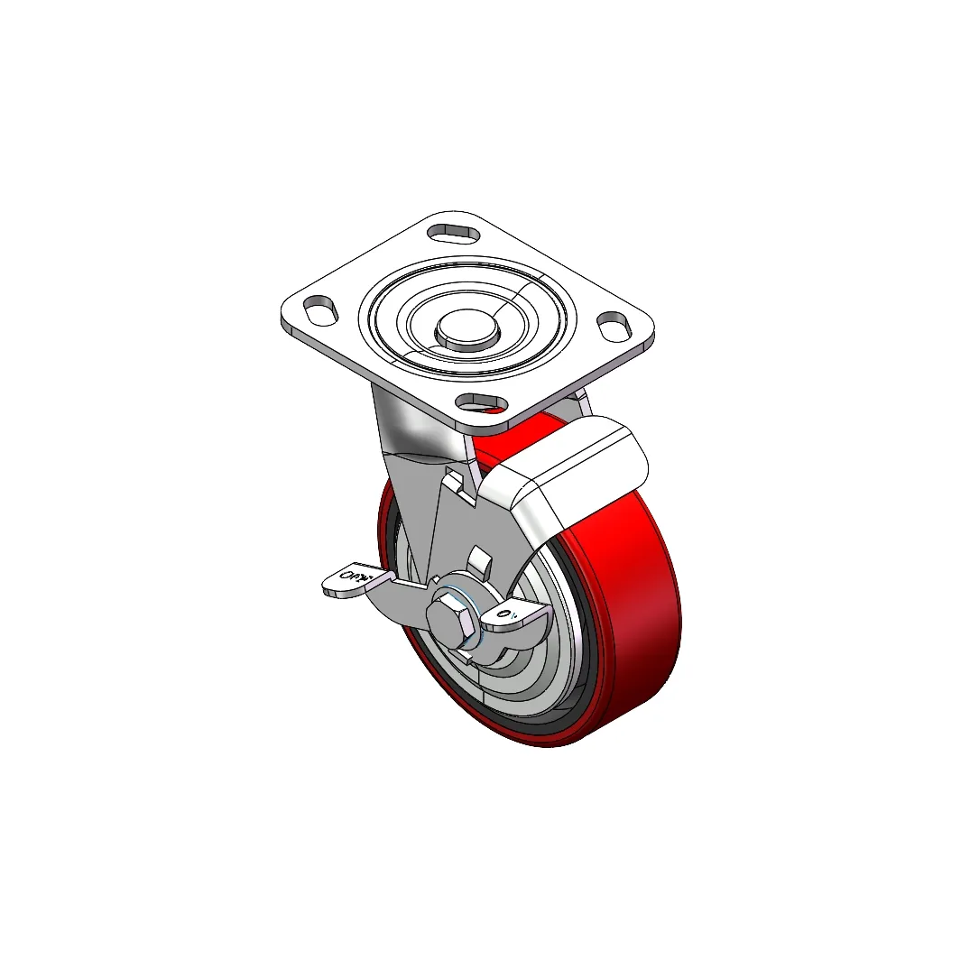 Side brake Caster with Locking system. Top Plate Riveted and Stamping D-shaped footplate. Hole Zine-Plated, Top Plate (4.5T) Mounting Type system Cast Iron Wheel Center with High Quality Polyurethane tread Red Cast Iron finish, Bearing—Ball Bearing.