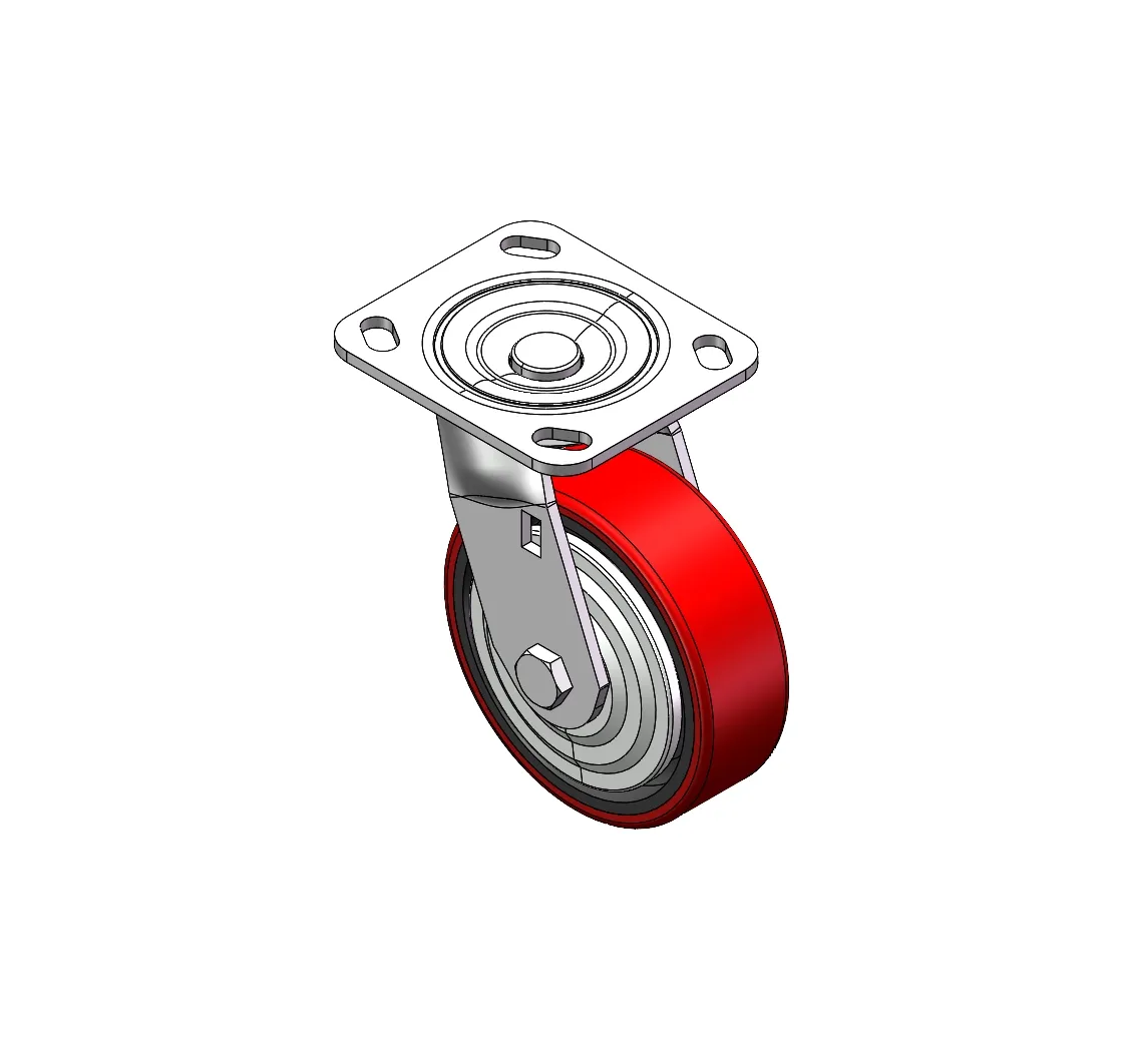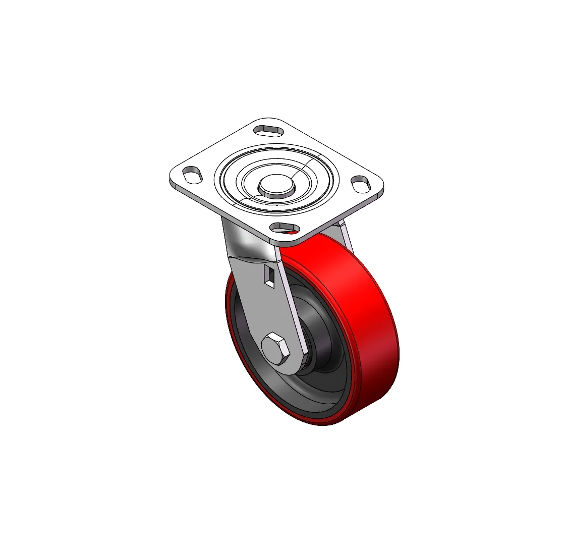 Swivel Caster, Top Plate Riveted and Stamping with 85 x 70mm (3-3/8" x 2-3/4") Bolt Hole Spacing Mounting Type. Zine-Plated, Top Plate (4.5T) Mounting Type mechanism. Cast Iron Wheel Center, High Quality Polyurethane tread. Red Cast Iron finish, Bearing—Ball Bearing.