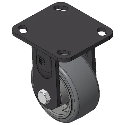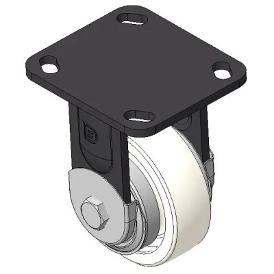 Rigid Casters, Welded Caster Fork, black painted finish. Base plate Mounting Type, 85x70mm Bolt Hole Spacing. Reinforced Polypropylene (PA6), natural finish. Bearings—Ball Bearings, with metal caps.