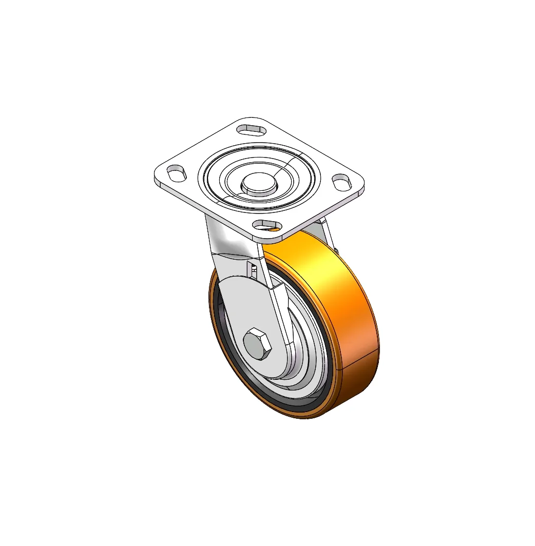 Center Brake Locking system. Top Plate with Riveted, Stamping Fork and 85 x 70mm (3-3/8" x 2-3/4") Bolt Hole Spacing. Zine-Plated, Top Plate (4.5T) Mounting Type system. Cast Iron Wheel Center with High Quality Polyurethane tread. Iron brown, Bearing with Ball Bearing.